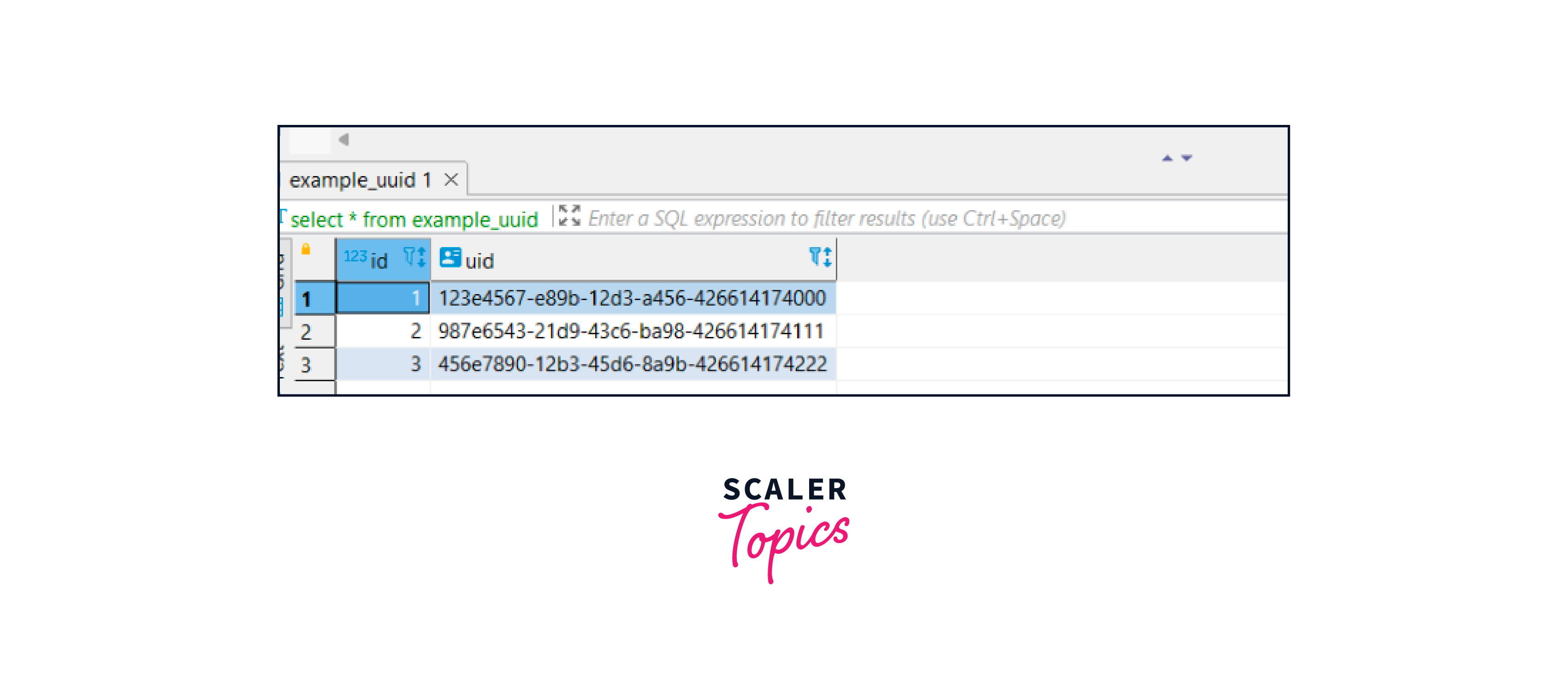 In this example, we are creating a table named example_uuid. The table consists of two columns: id and uid. The uid column is of type UUID. The uid column is also specified as the PRIMARY KEY of the table, which means that its values must be unique and not null.