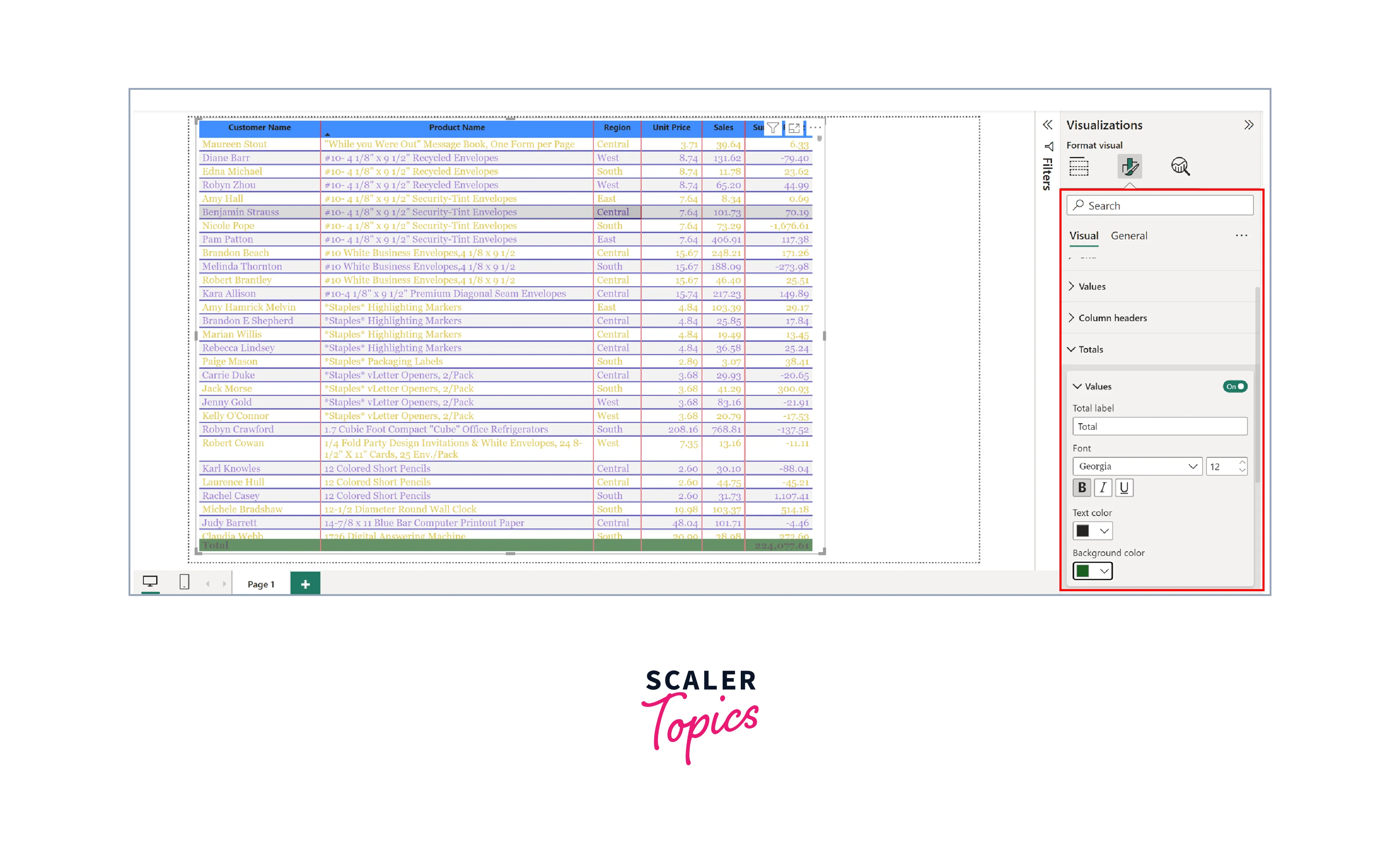In the Total section, you can customize the text and background color of the totals in your Power BI table. You can make the totals stand out by altering the Totals font type and color, setting the background color, and adding an outline to the top and bottom of the Total.