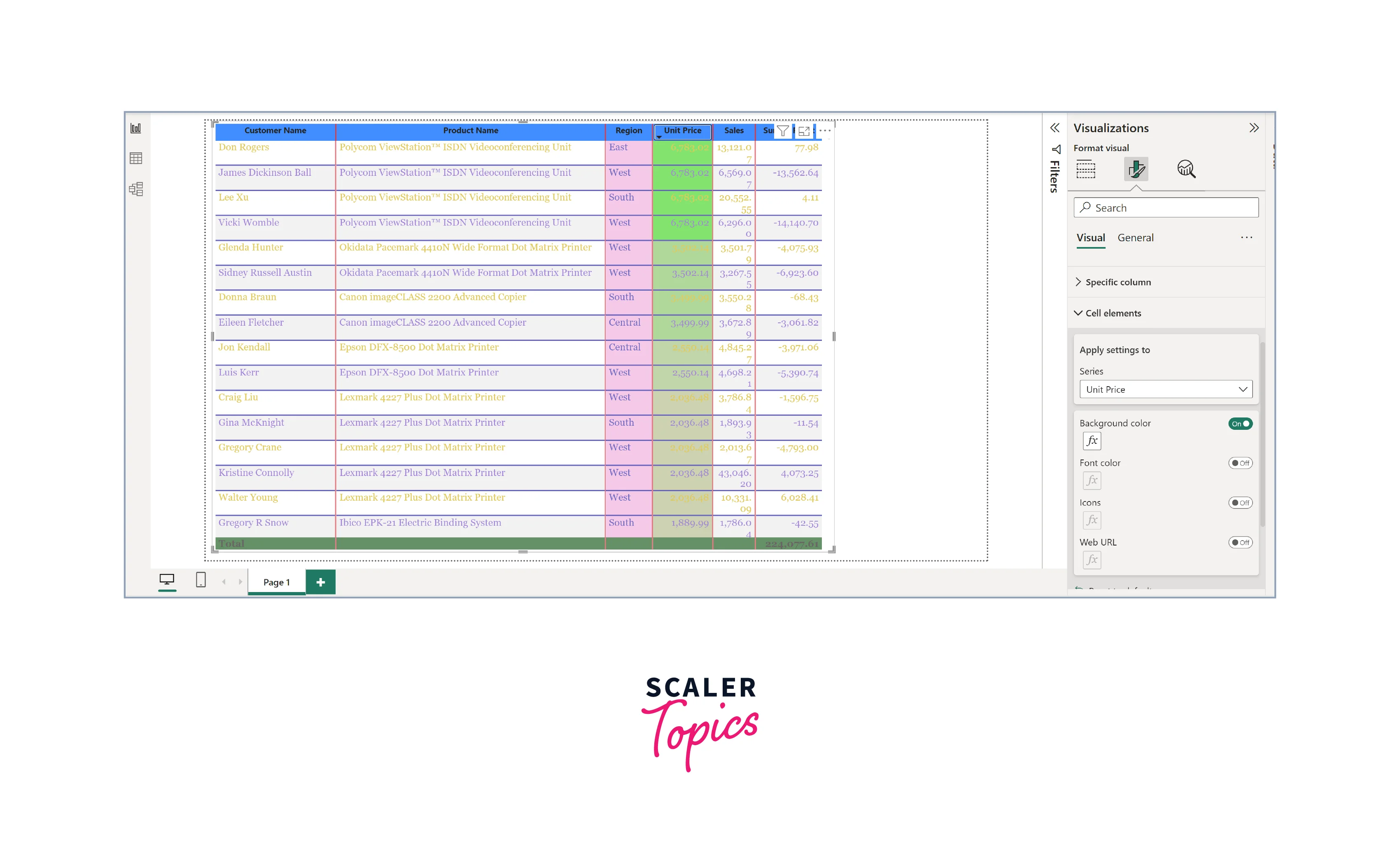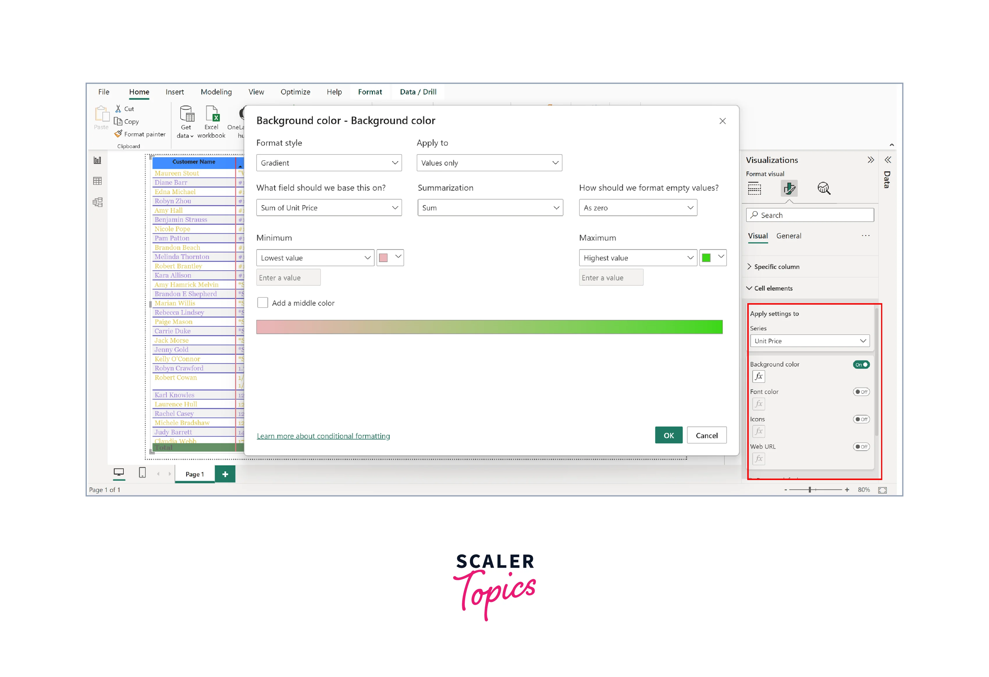 As shown in the figure below, we have implemented conditional formatting on the "UnitPrice" column. By utilizing a background color scale, we have configured the scale to range from red for lower values to green for higher values.