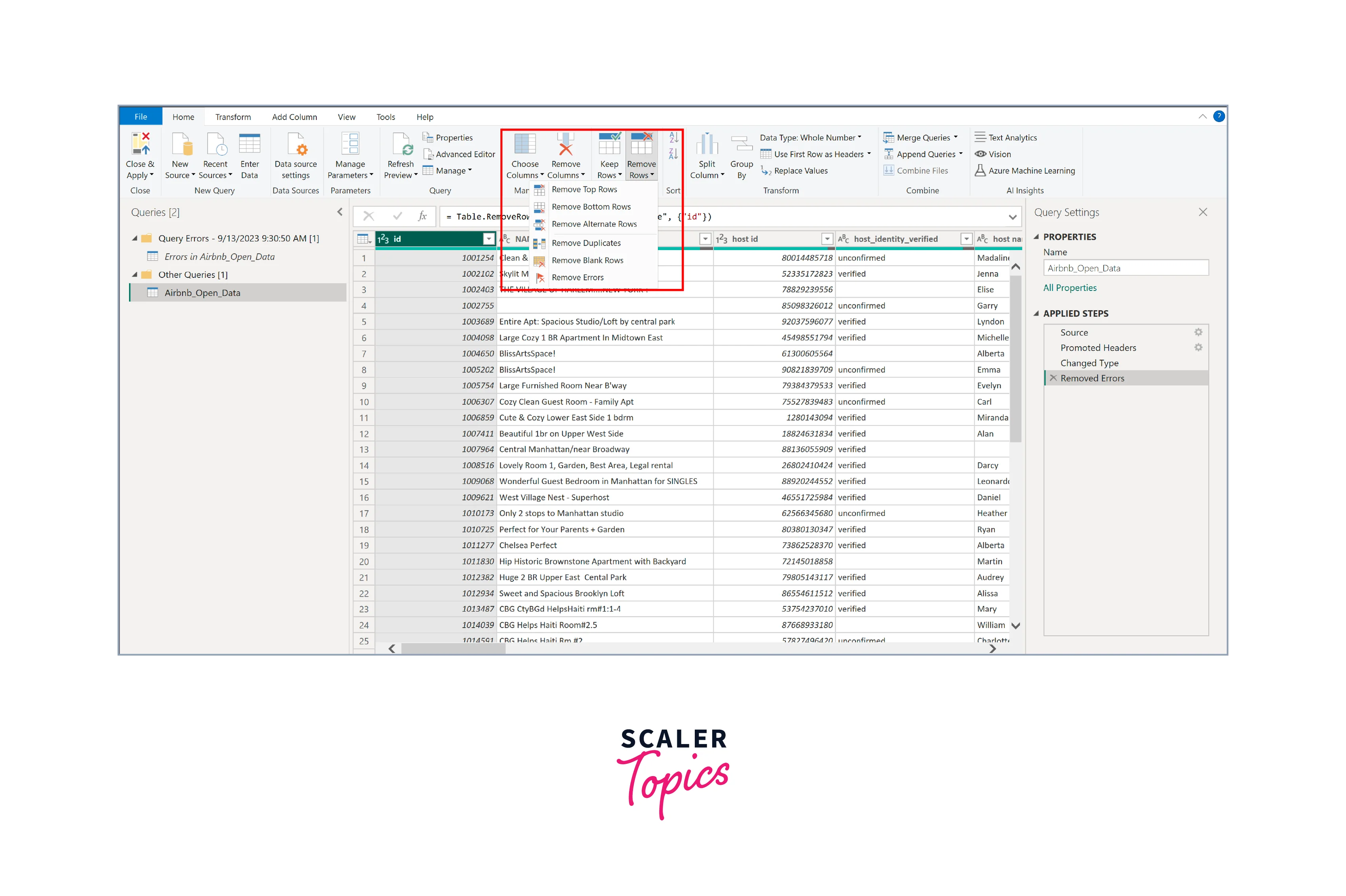 Next, we'll closely examine the data to find any missing information. If we find any gaps, we'll decide how to deal with them. Sometimes, we can make educated guesses to fill in the missing data (that's called imputation), but if we can't do that reliably, we might have to remove those parts from our analysis. Upon importing the Airbnb dataset into Power BI, you will see a few entries containing errors. For the further analysis, we will remove these records from the dataset, as shown in the figure below.