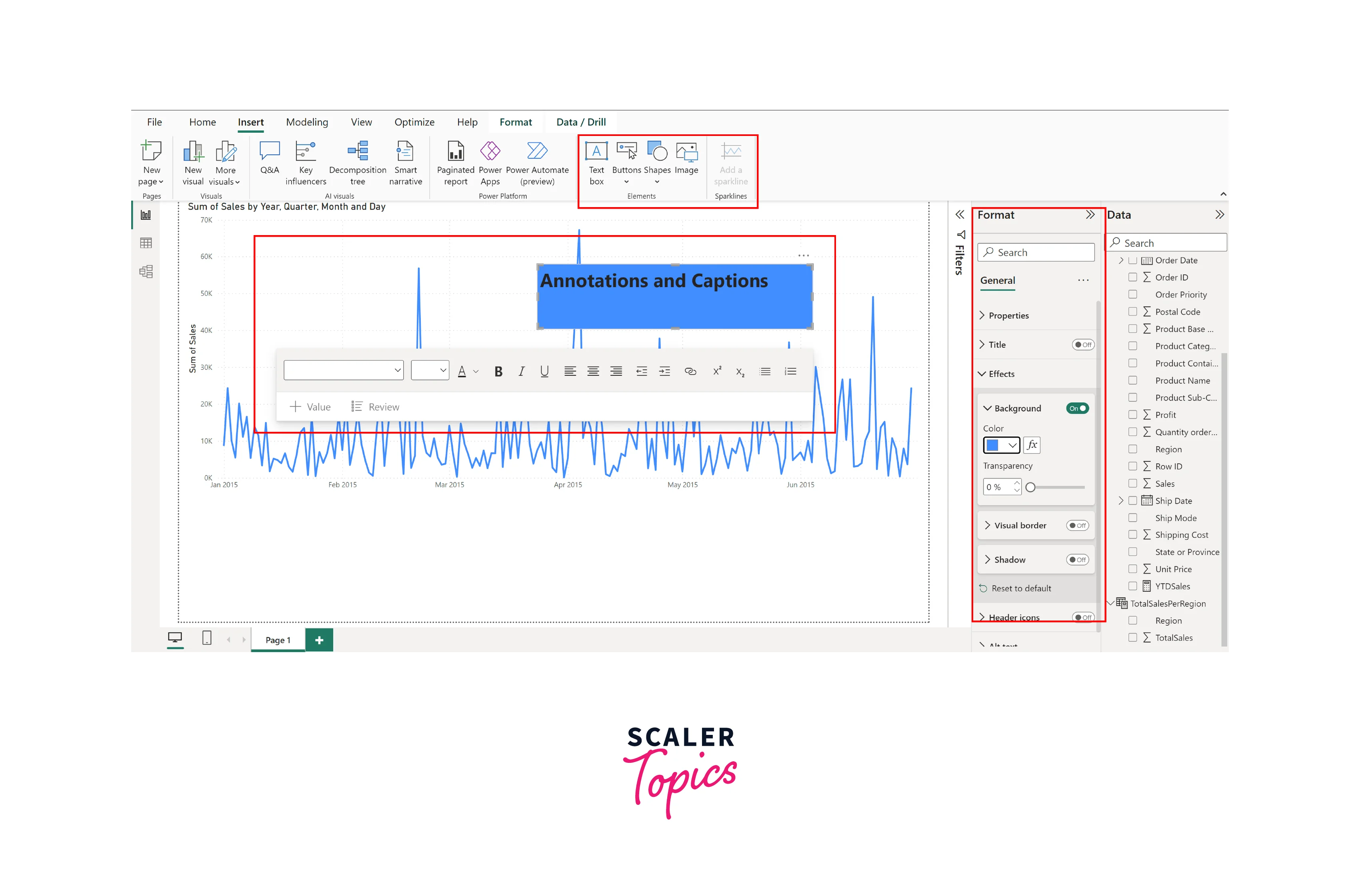 - For annotations and captions, you can add text boxes, lines, or shapes directly onto the visual. These can contain explanations, callouts, or additional information.
