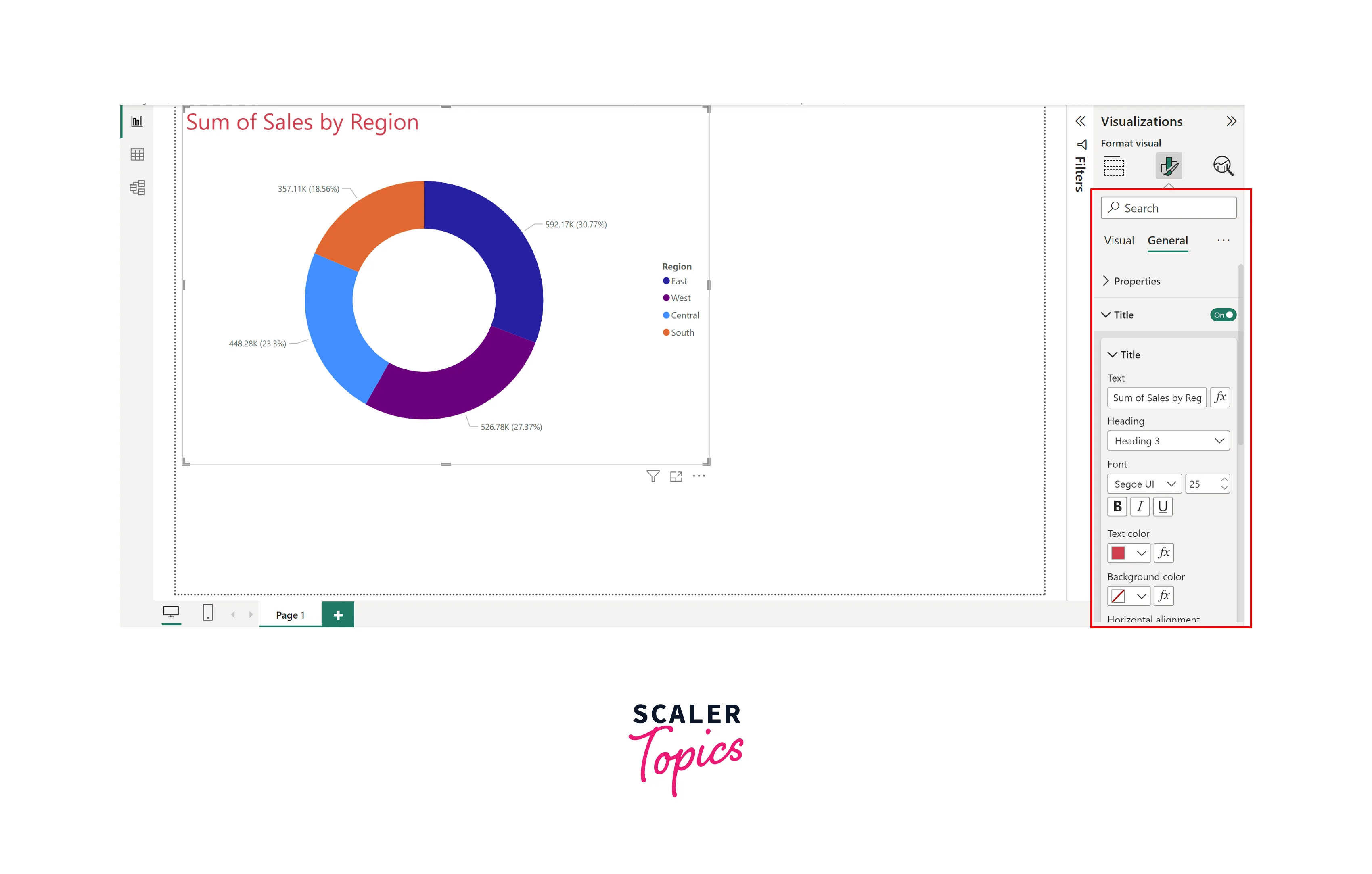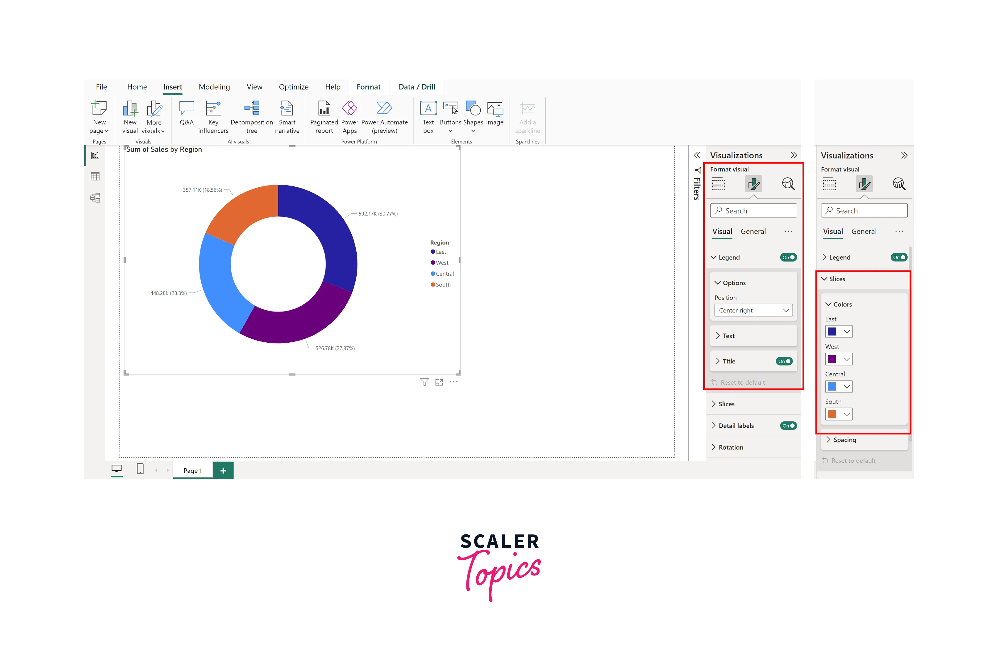 - To format colors, go to the respective section in the Format Visual pane, such as slices in a donut chart, bars in a bar chart, etc. You can also create custom color palettes to ensure consistency and alignment with your brand or reporting standards.