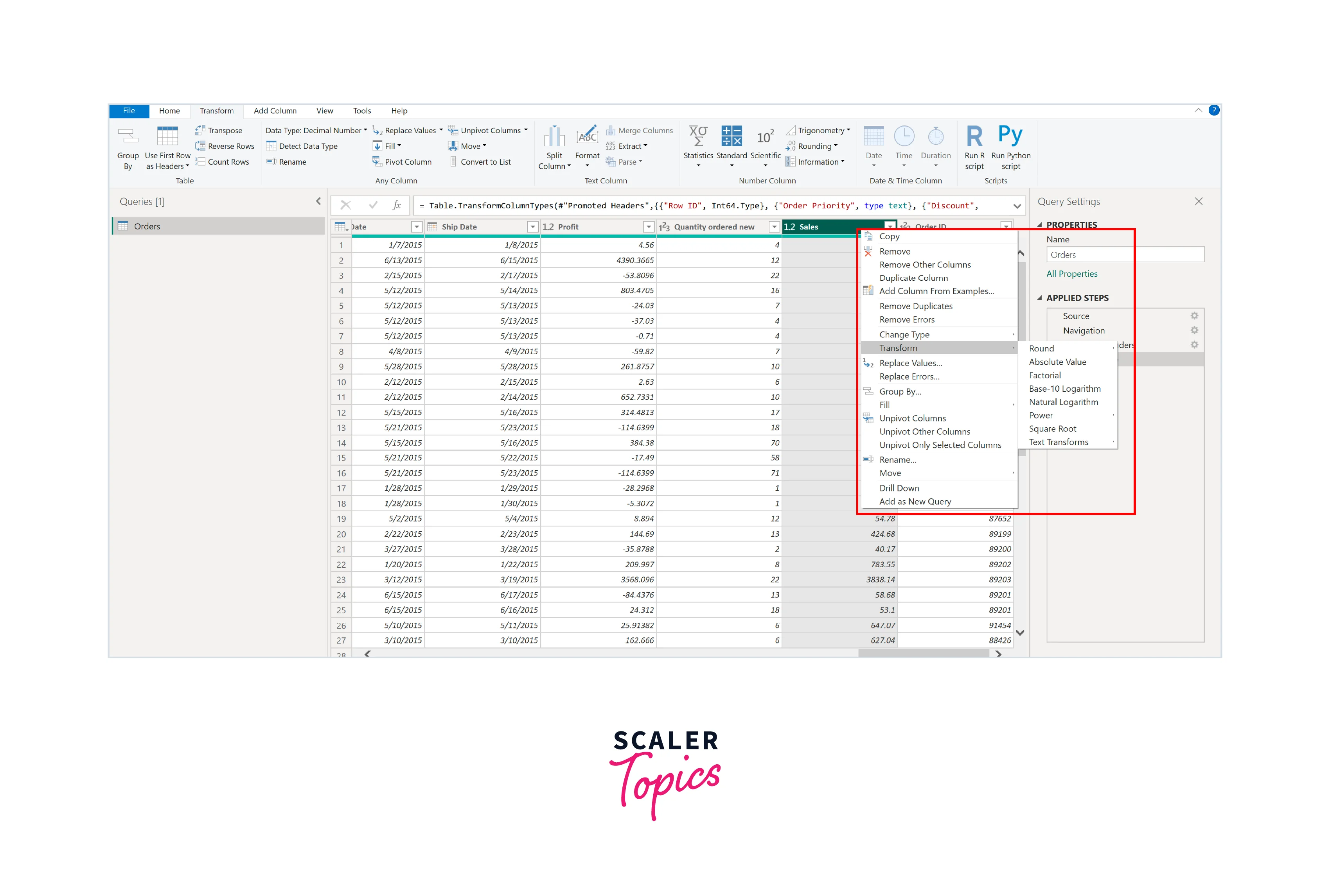 - From the Transform menu, you can choose the formatting type that suits your data, such as rounding of the numbers, absolute values, factorial, logarithmic, etc.