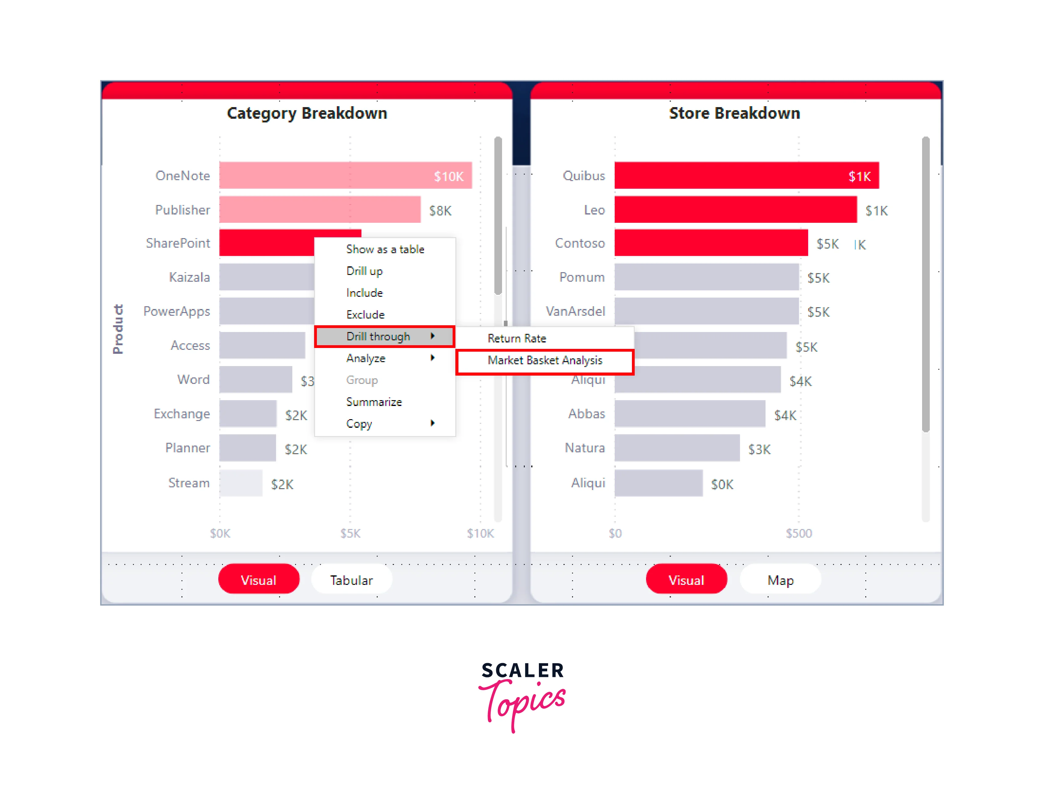Drill-through filters in Power BI enable users to create a hierarchical navigation experience, allowing them to focus on specific details within a report. By defining drill-through paths, users can click on data points in a visualization to "drill through" to another page or report, displaying more detailed information about the selected data. For instance, in a sales report, users can set up a drill-through filter for the "Product Category" field. When they click on a specific product category, such as "Electronics," Power BI will navigate them to another page that shows a detailed sales analysis exclusively for electronics.