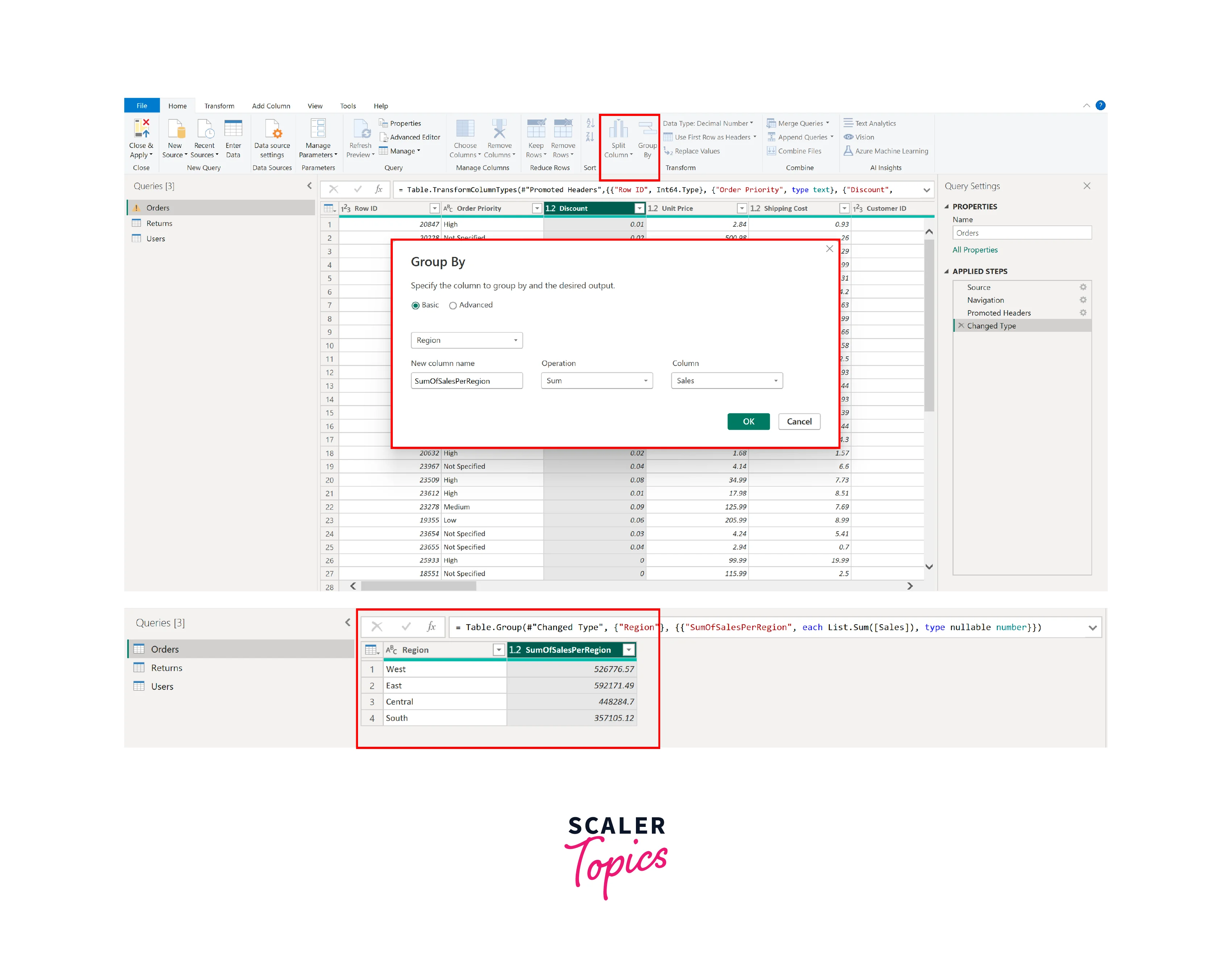 Your data will now be grouped and aggregated according to your specifications, creating a summarized dataset that you can use for analysis and visualization in Power BI. For instance, if we want to see total sales per region, we can group by and aggregate the sales data, as shown in the figure below: