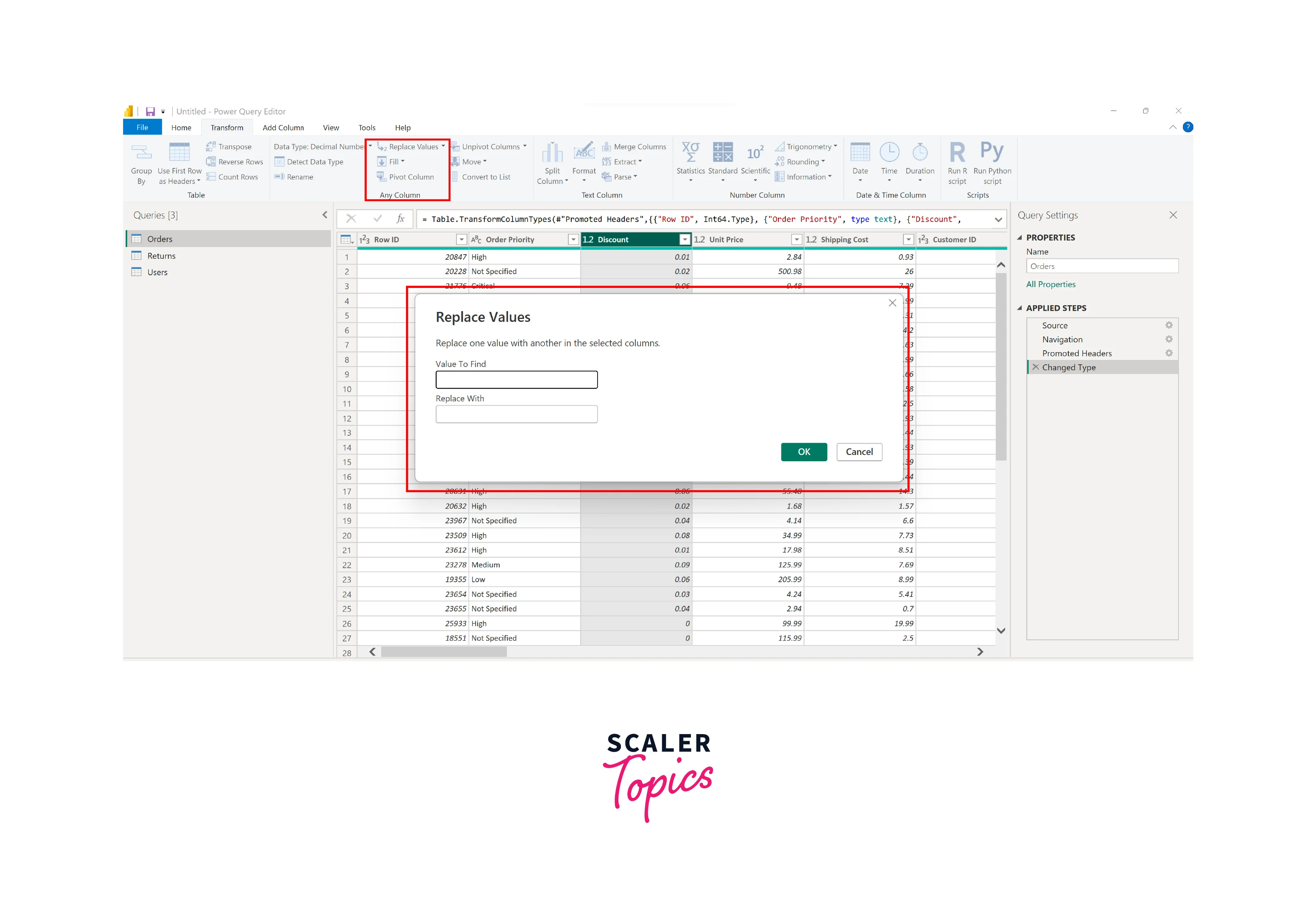 The "Replace Values" option is located on the 'Transform' tab of the ribbon. Within the advanced menu, you can introduce special characters for matching entire cell contents. This feature is valuable for cleaning up datasets plagued by typos or values needing more detail.