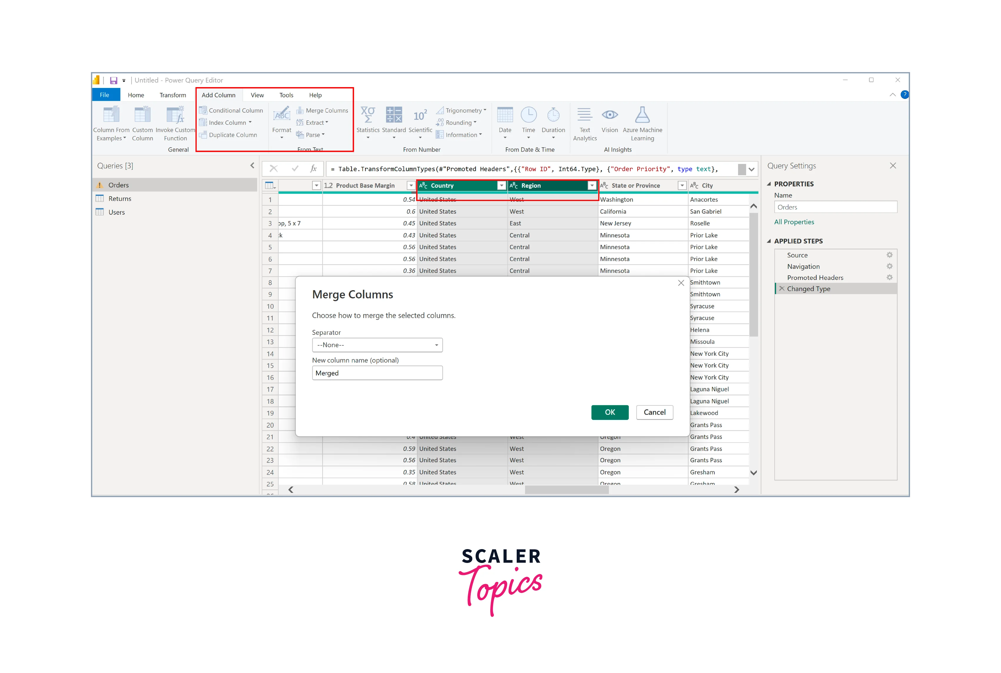 - This action will open the Merge Columns page, allowing you to define the separator for the columns. Click "OK" to complete this Power BI Transform Data operation.