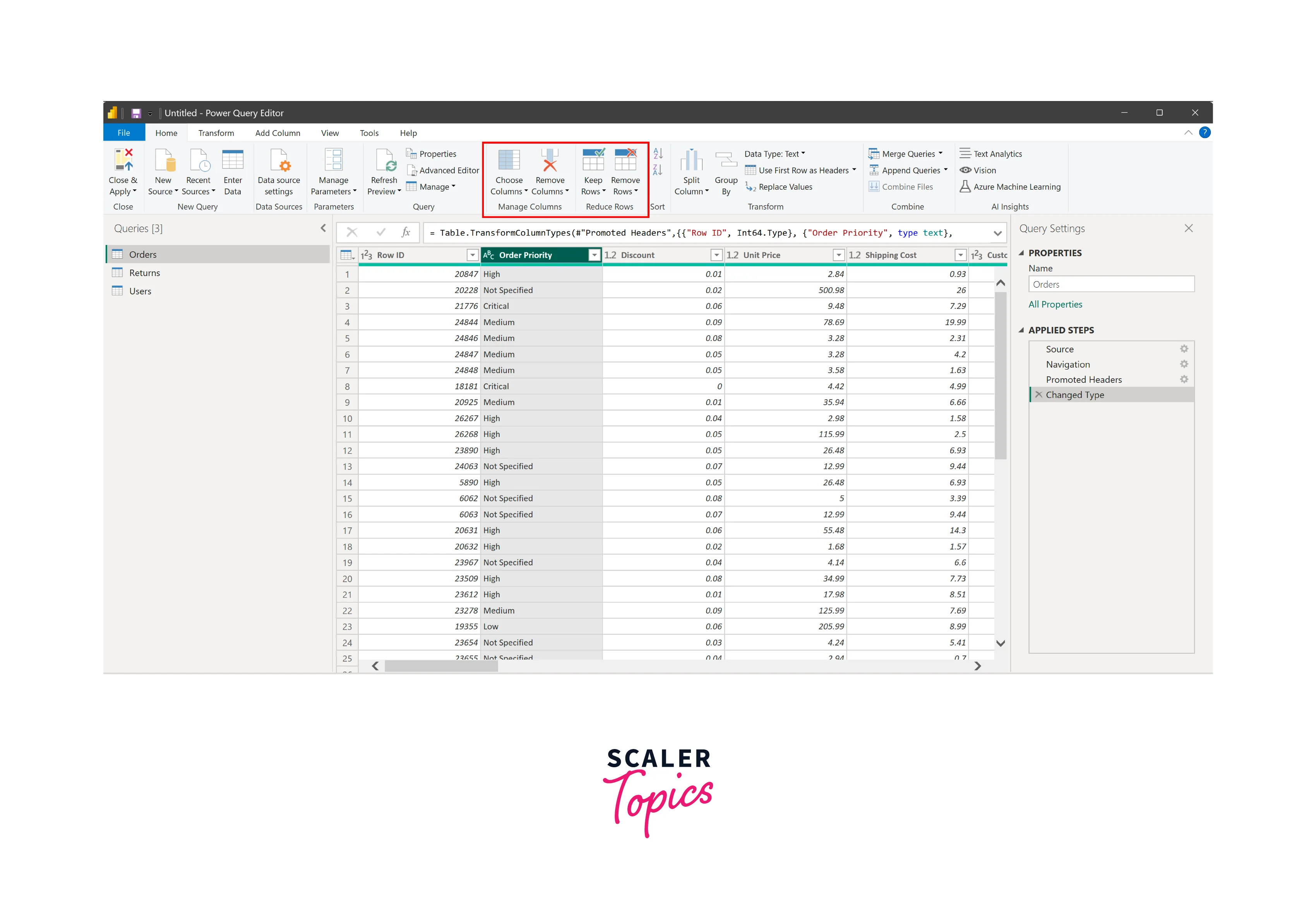 When dealing with large datasets, it's often necessary to refine the data by removing unnecessary columns and rows. In Power BI Data Transformation through the Power Query Editor, you can achieve this by accessing the options found under the Home tab, such as Choose Columns, Remove Columns, Keep Rows, and Remove Rows. These Power BI Data Transformation tools empower you to remove unwanted data from your dataset efficiently.