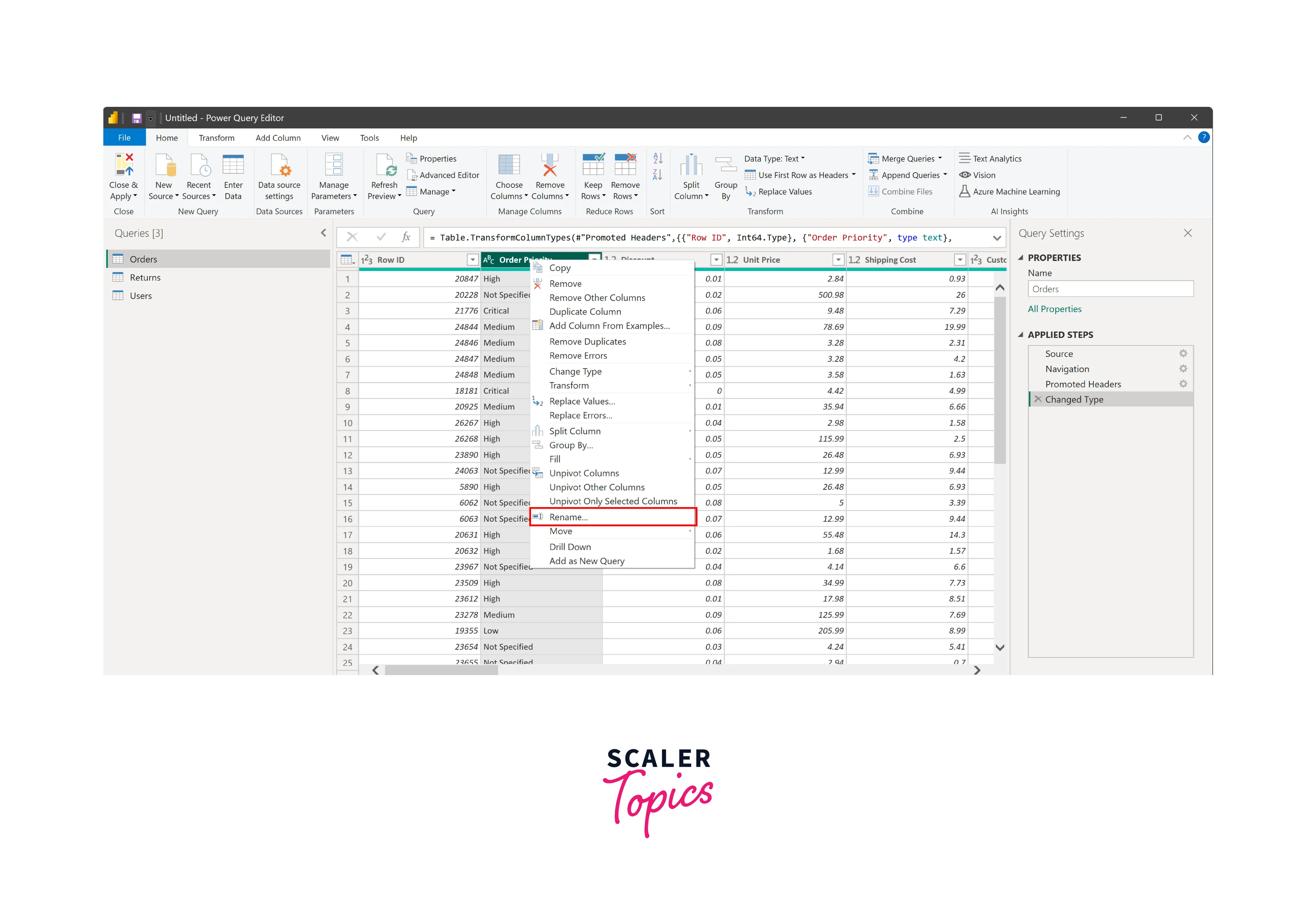 In Power BI's Transform Data, renaming a column header is straightforward. Simply double-click on the column heading, then replace it with a new name. Alternatively, you can right-click on the column and choose "rename" to achieve the same result.