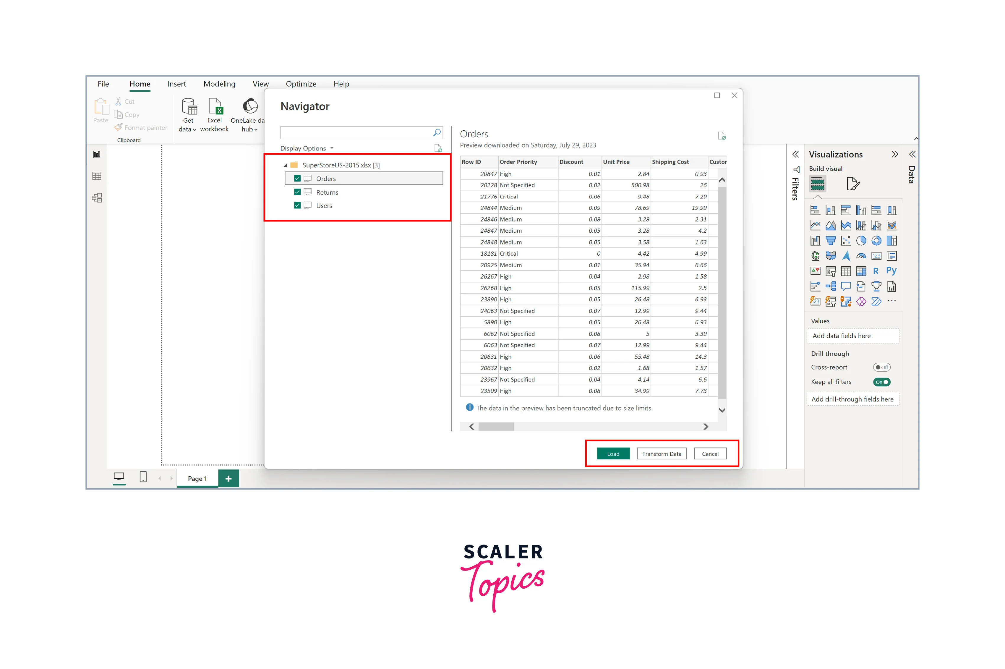 Select "Excel" to initiate a window where you can locate the specific file you want to upload from your device. Following this, on the Navigator page, you can choose the datasheets you want to load by checking the relevant boxes. To perform Power BI data transformation, click "Transform Data". Alternatively, you can simply click "Load" to upload the file without applying any transformations.