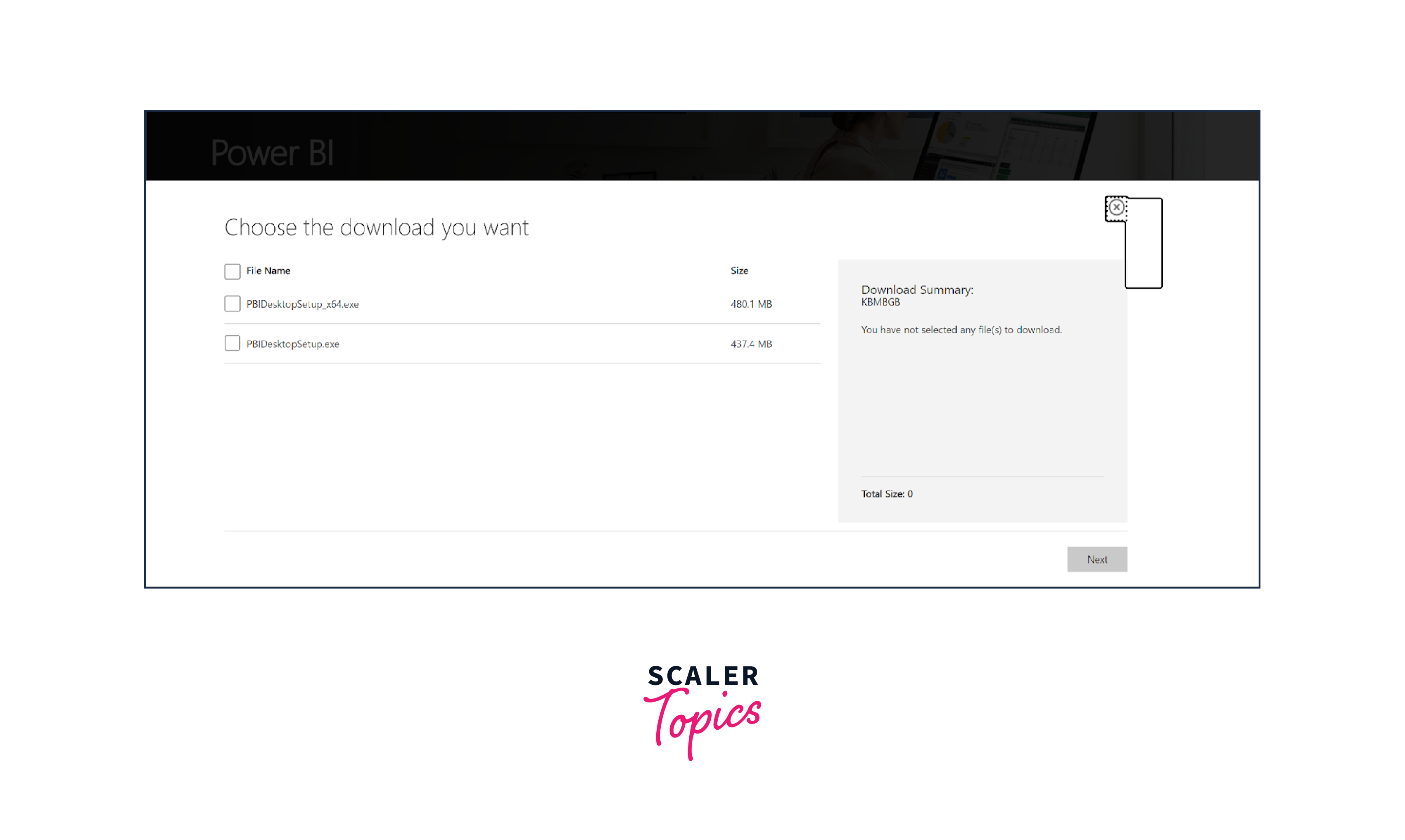 Step 3 - The download button will provide you the option to select either a 32-bit or 64-bit downloadable OS file, depending on the architecture of your system. After selecting the appropriate OS file, click the next button to download the setup file. For this article, we will select the PBIDesktopSetup_x64.exe file.