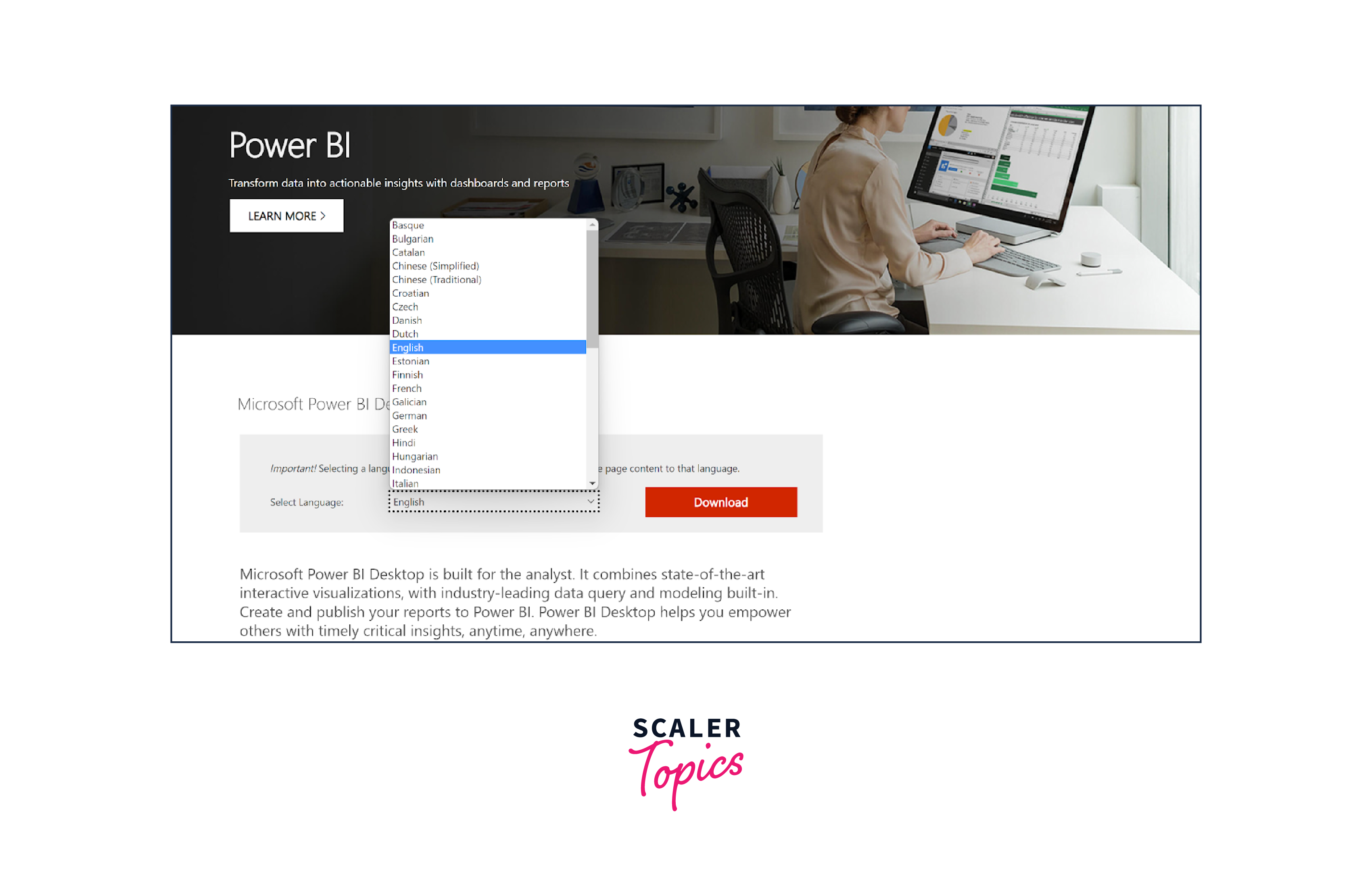 Step 1 - To download the Power BI Desktop application, visit the https://powerbi.microsoft.com/en-us/desktop/. Below is an image that illustrates the download page on the official website, where you can find the download or language options.
