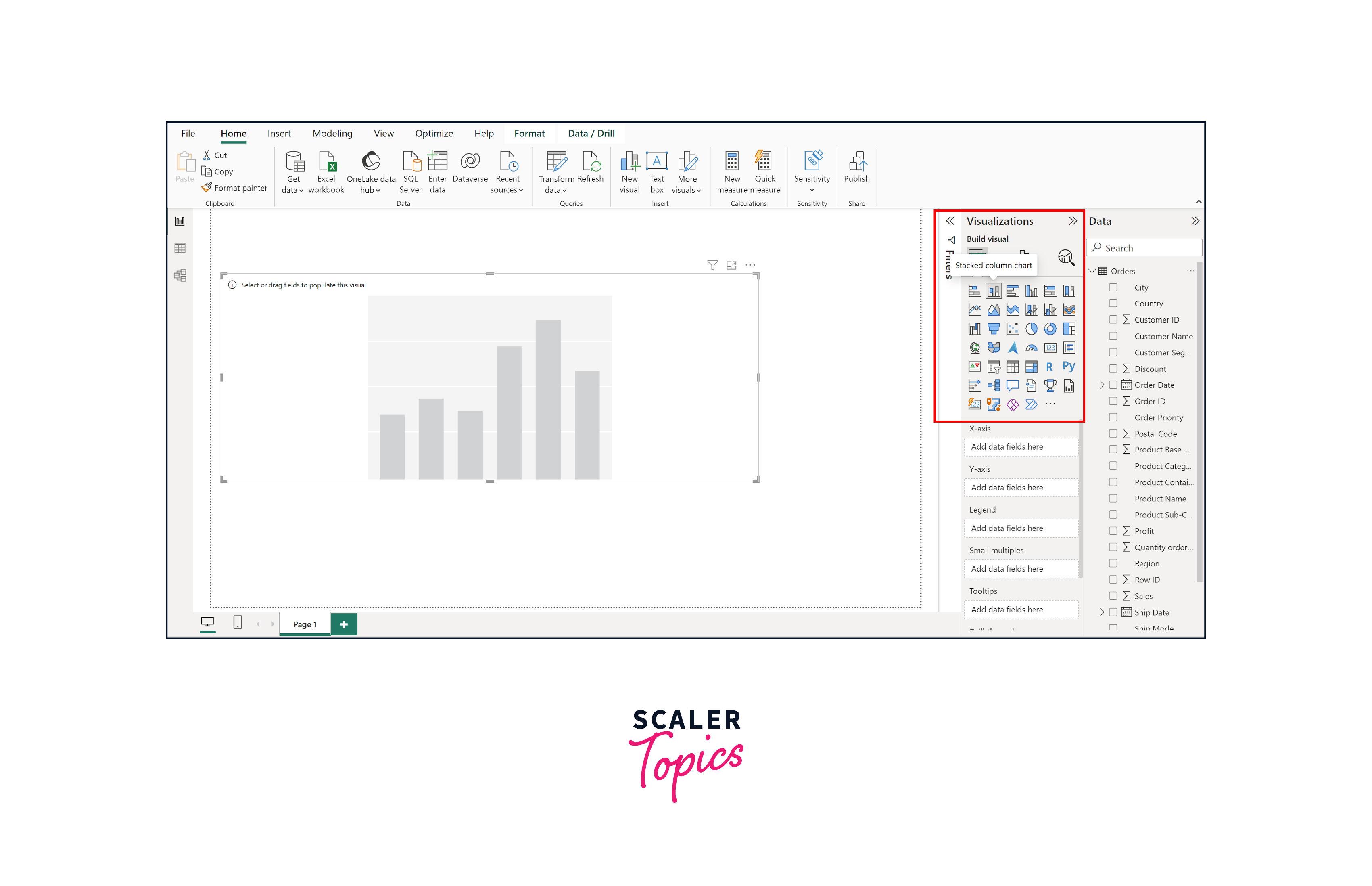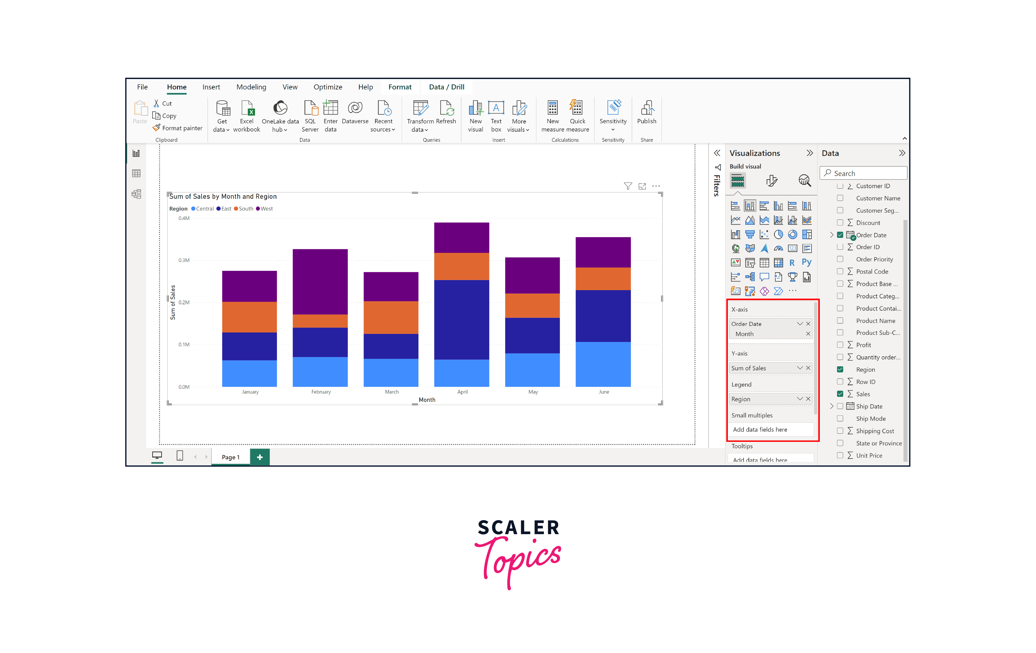 In the "Fields" pane, drag and drop the appropriate data fields into the visualizations' placeholders. Assign fields to categories such as Axis, Values, Legend, and Tooltips based on the type of chart you're creating. In this instance, we will generate a bar chart that showcases sales on a monthly basis across all stores for each region.