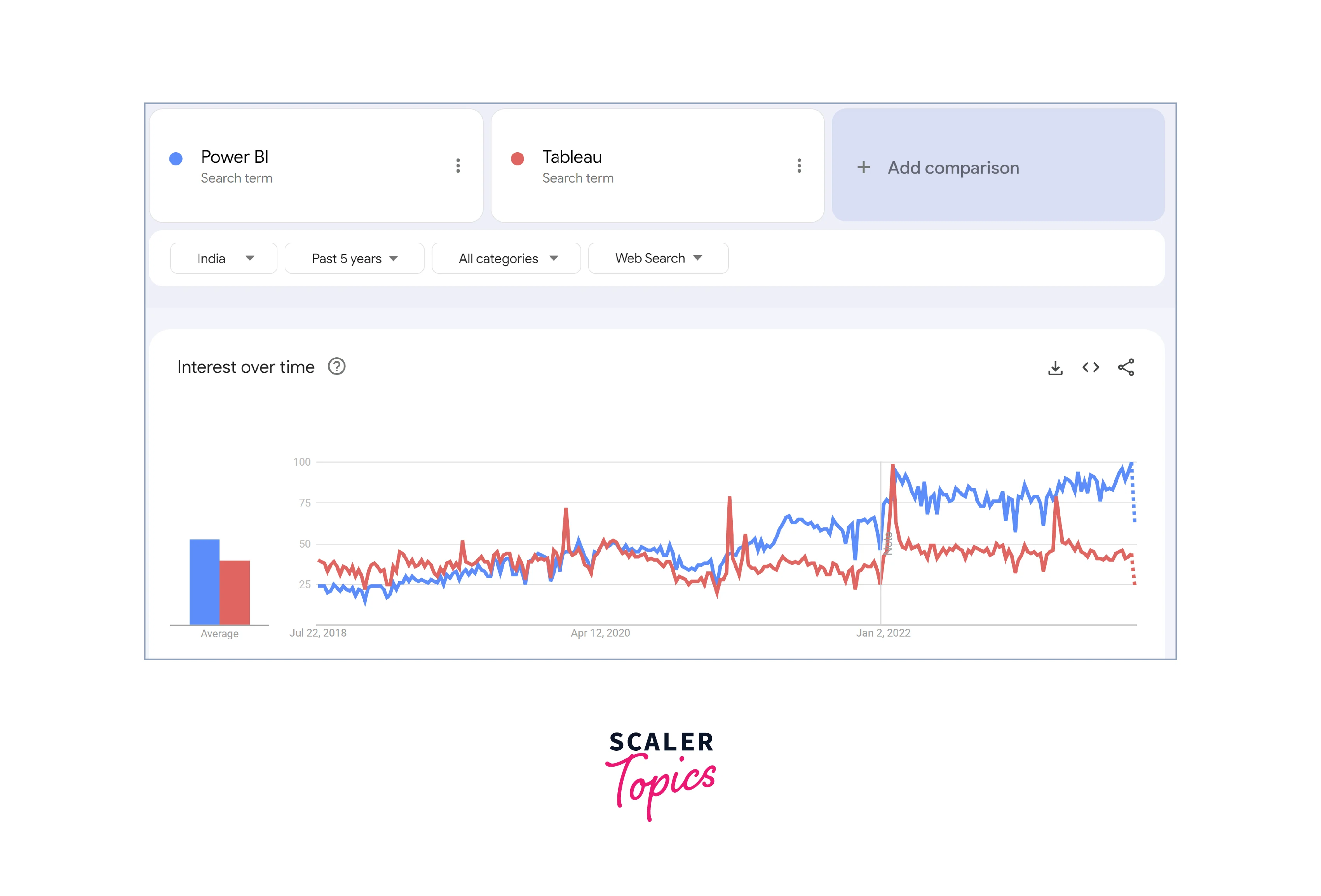 Over the past five years, Google Trends data for Power BI vs. Tableau for India indicates that Tableau used to outperform Power BI regarding search interest. However, since around mid-2020, the trend has shifted for Google Trends data for Power BI vs. Tableau, and Power BI's popularity has been consistently surpassing Tableau. The gap between the two tools has significantly widened, making Power BI the clear winner in terms of search interest in India.
