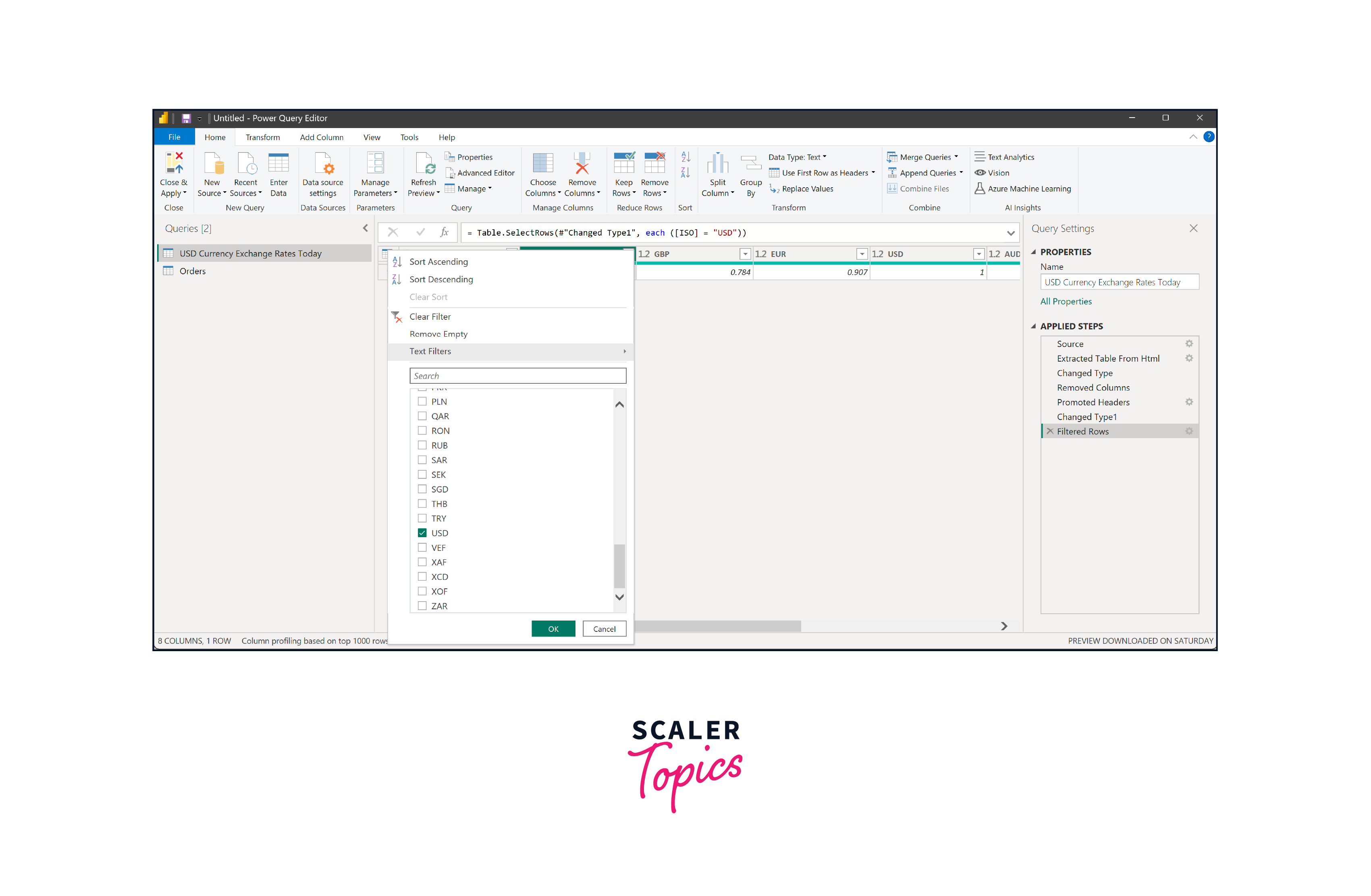 Suppose we wish to retain only the USD currency data in our example. Here's how you can achieve it. To filter out unwanted rows from the table in Power BI, a user can follow the below steps -
