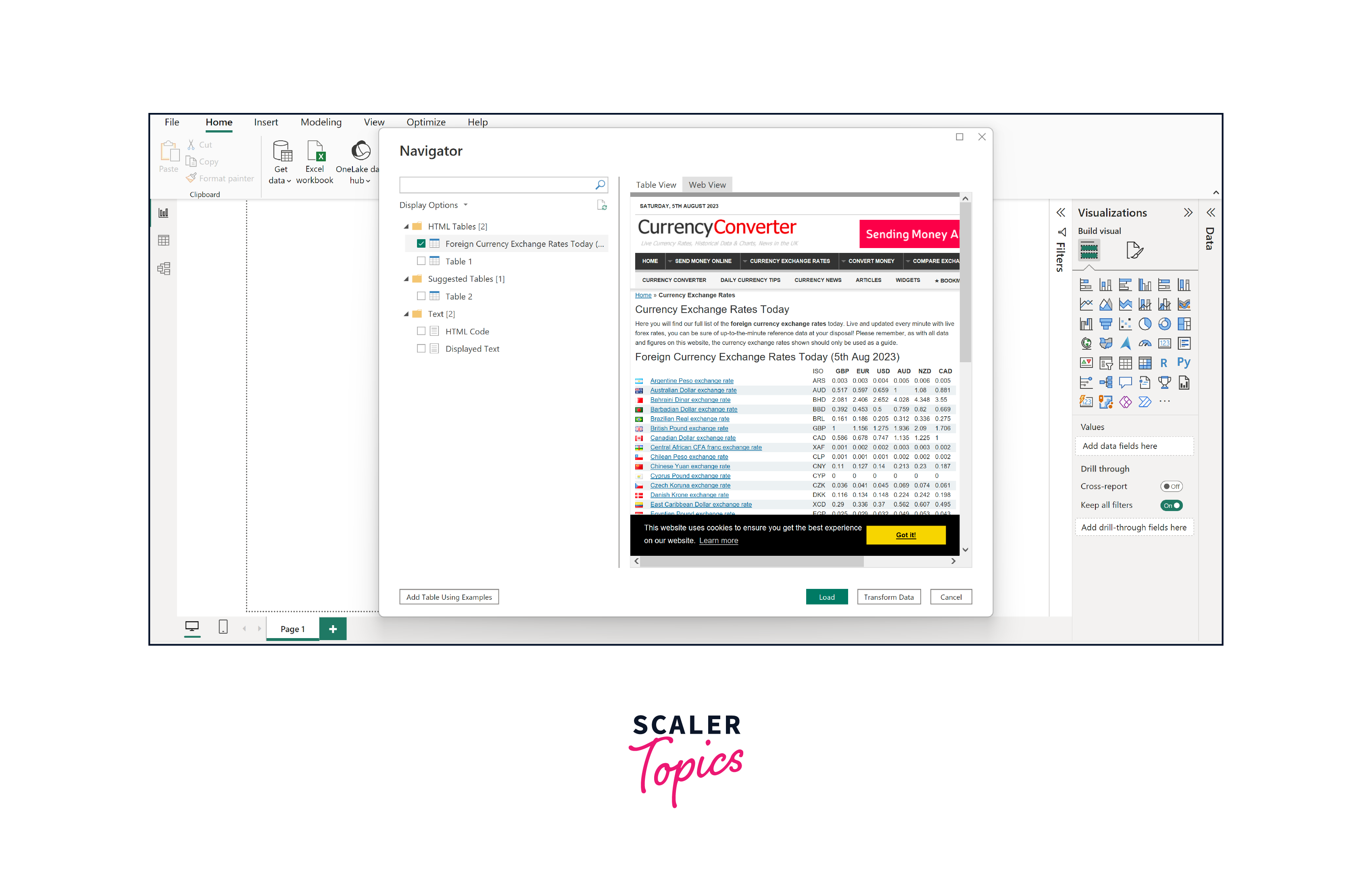 We are interested in the table containing exchange rate information for our case. Thankfully, Power BI offers a helpful feature when connecting to web pages - switching to web view. This feature displays a table preview as it appears on the webpage, making it easier to locate the correct table. In our example, we will select the table labeled "Foreign Currency Exchange Rates Today ( .. )" to import and analyze the currency exchange rate data with Power BI web tools, as shown in the below figure.