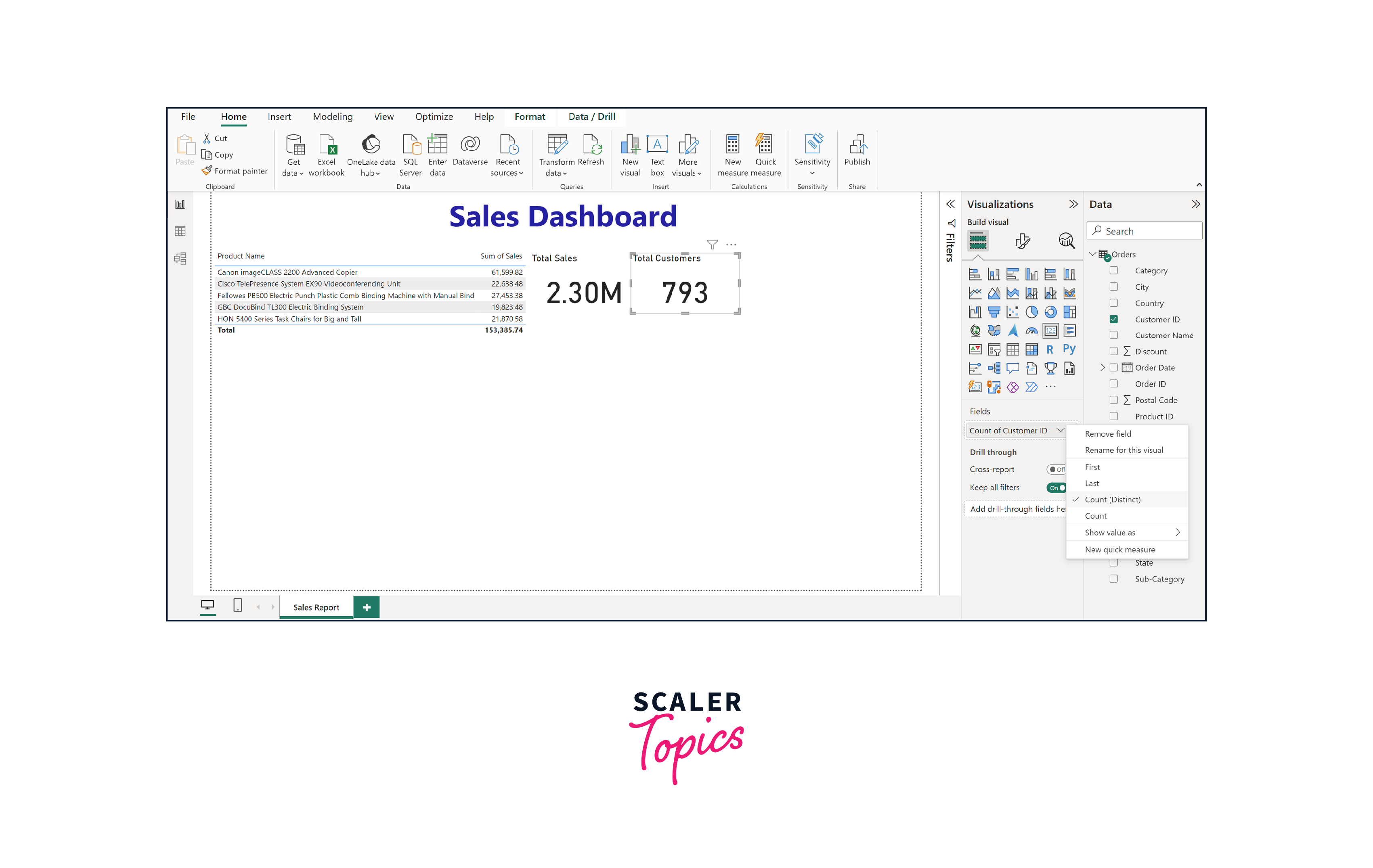 Now, opt for two card visuals within the Build Visual section. For the first card visual, place the Sales column in the Fields section using the "Sum" aggregation and label the card title as "Total Sales" in the format visual section. In the second card visual, include the Customer Name column in the Fields section with a "Count(Distinct)" aggregation and label the card title as "Total Customers", as shown in the figure below.
