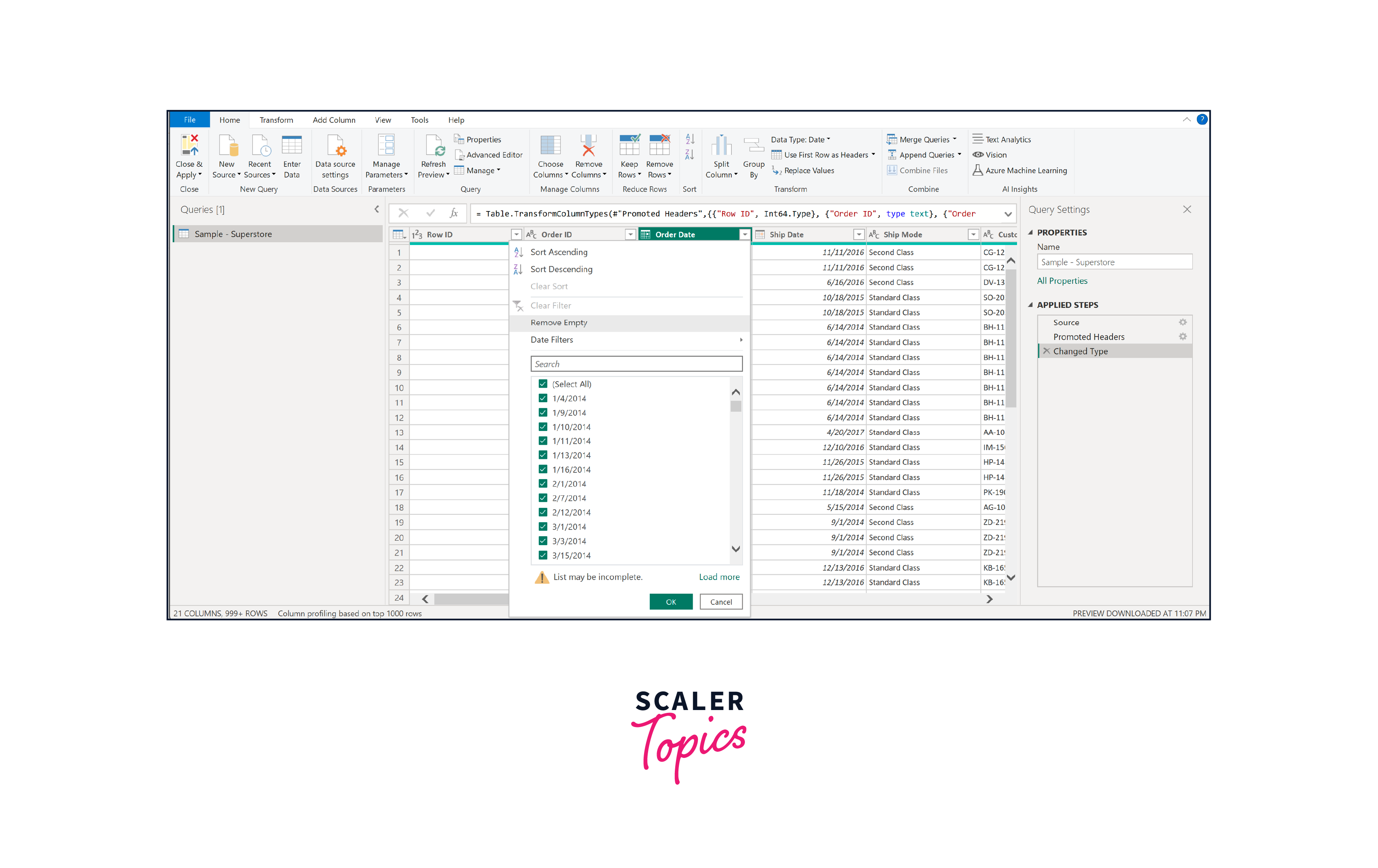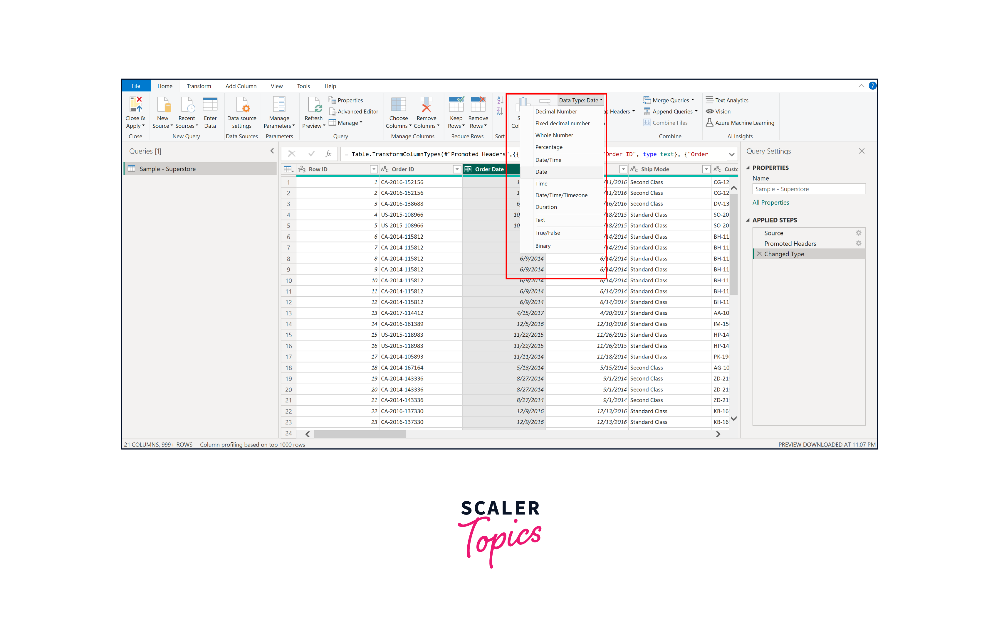 Next, proceed to click on each individual column and verify whether the correct Data Type has been assigned or not. In cases where the Data Type is not accurately assigned, make the necessary adjustments by selecting the appropriate Data Type from the dropdown menu. For instance, ensure that columns like Order Date and Ship Date are set to the "Date" Data Type.