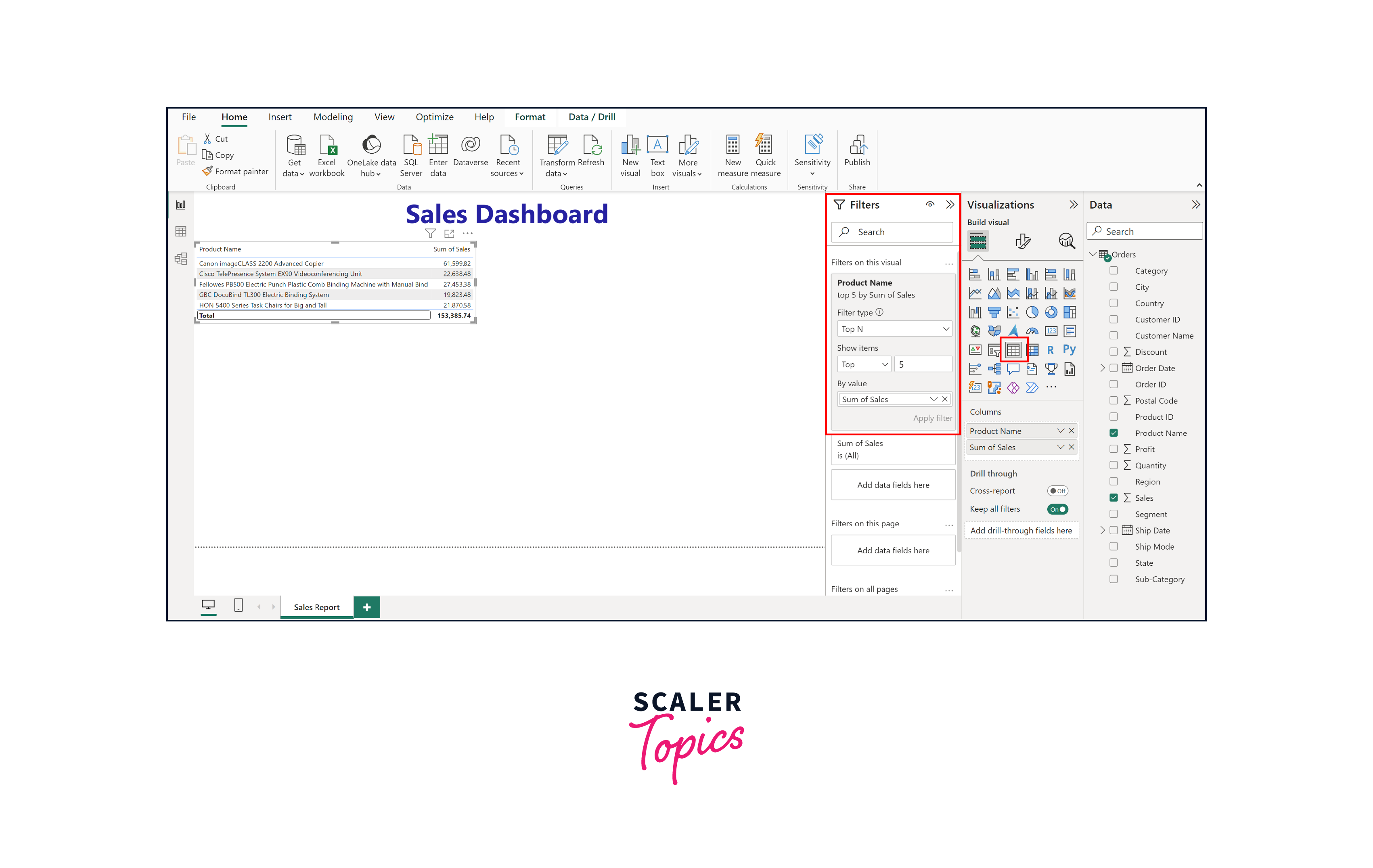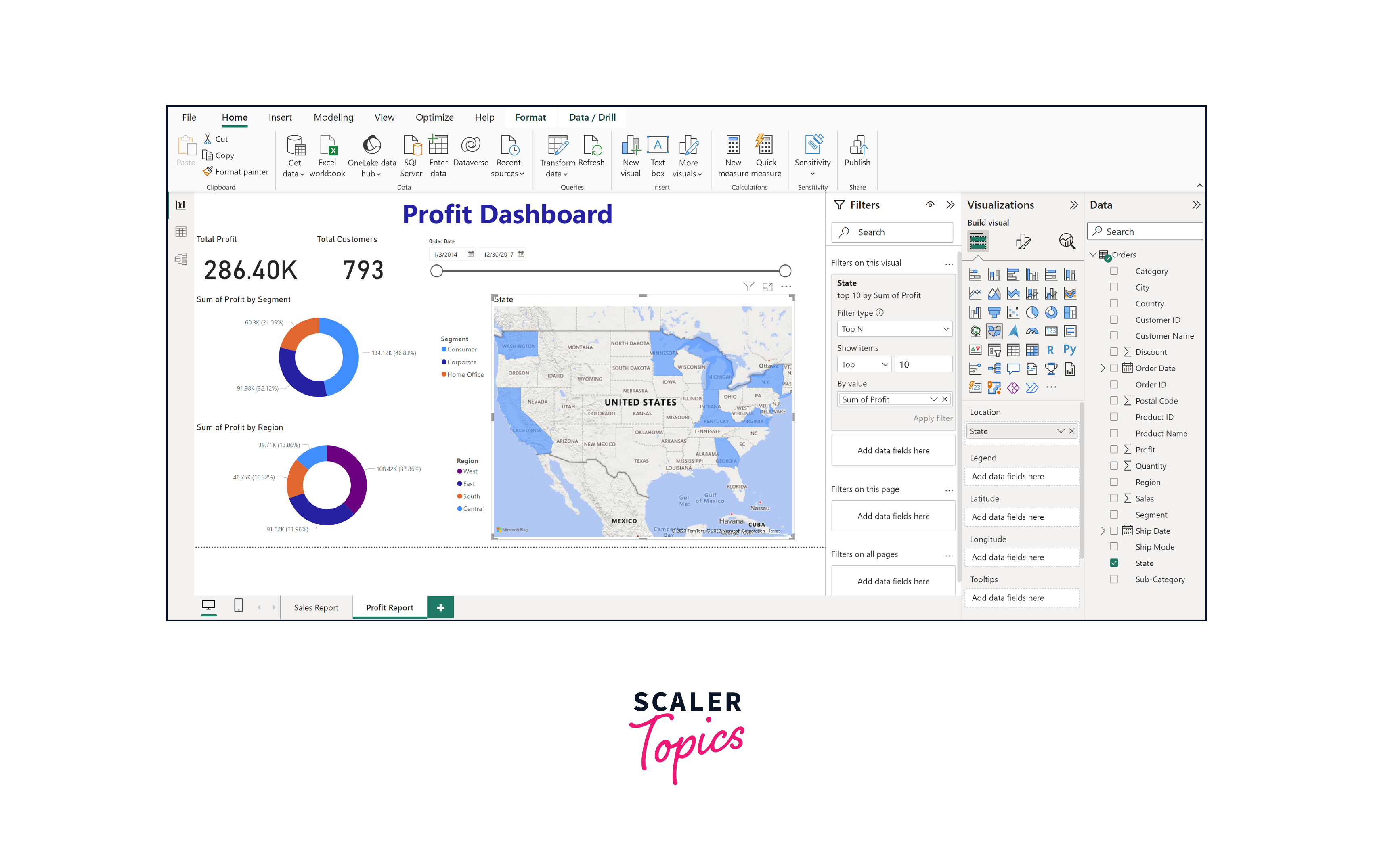To effectively visualize the Top 10 States based on Profits, we will employ the Filled Map visual. This can be achieved by applying a Top N filter on the State dimension, showcasing the states that yield the highest profits in a geographical context.