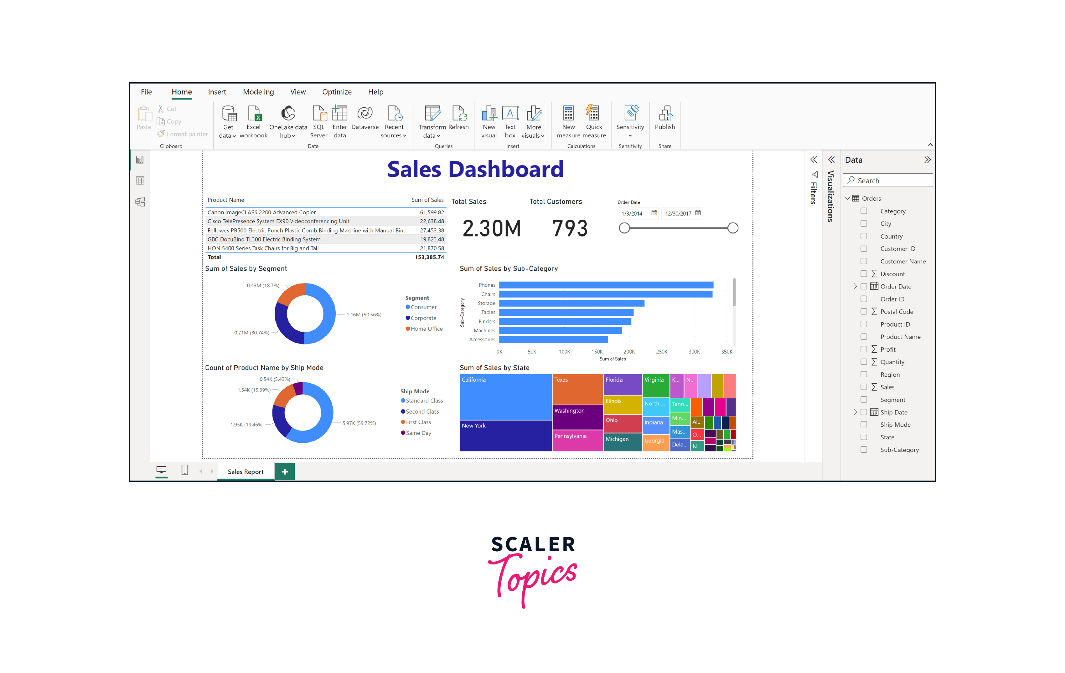 Moving forward, we will make use of a horizontal bar chart to illustrate the sales figures for each subcategory of our products. Additionally, we'll employ a treemap visualization to showcase the sales distribution across different states, as shown in the below figure. With the sales report now finalized, we'll transition to constructing a profit report using the Superstore dataset.