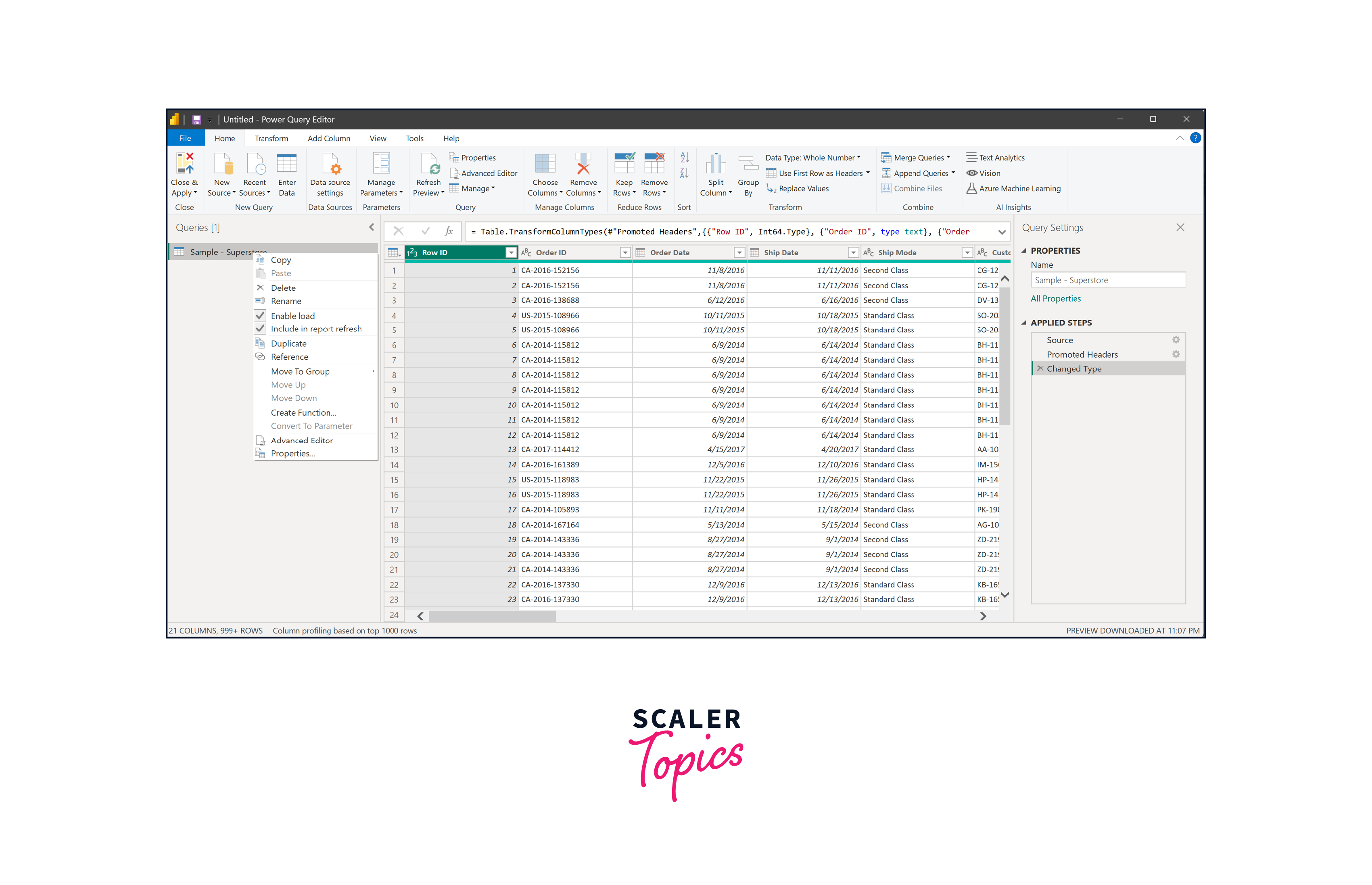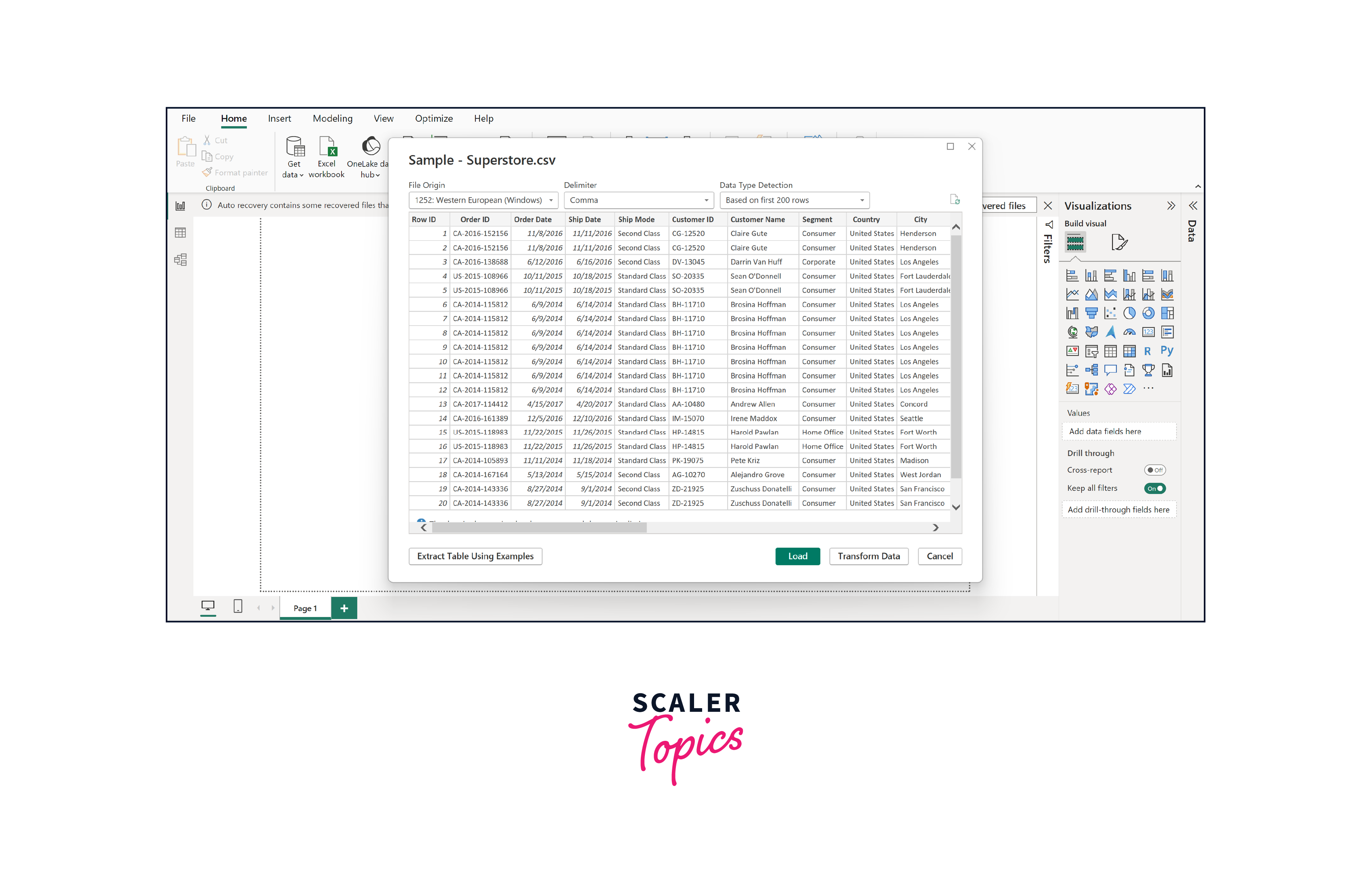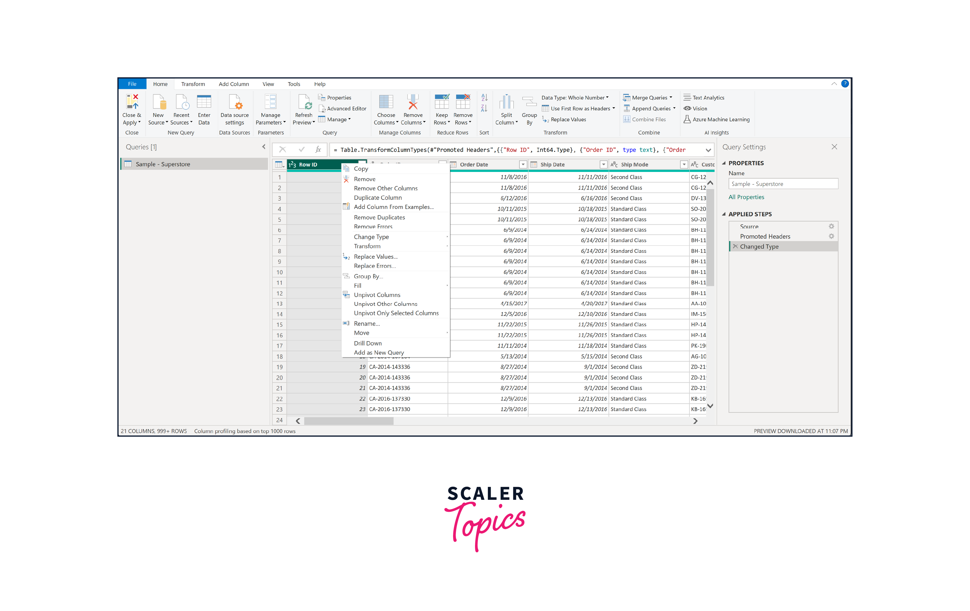 We will click on the "Transform Data" option in the previous image to initiate several data transformation actions on the dataset. Now, let's proceed with the different stages of transforming the loaded Superstore dataset. These steps encompass activities like cleaning the data, verifying column data types, and eliminating records with missing values (NULLs).