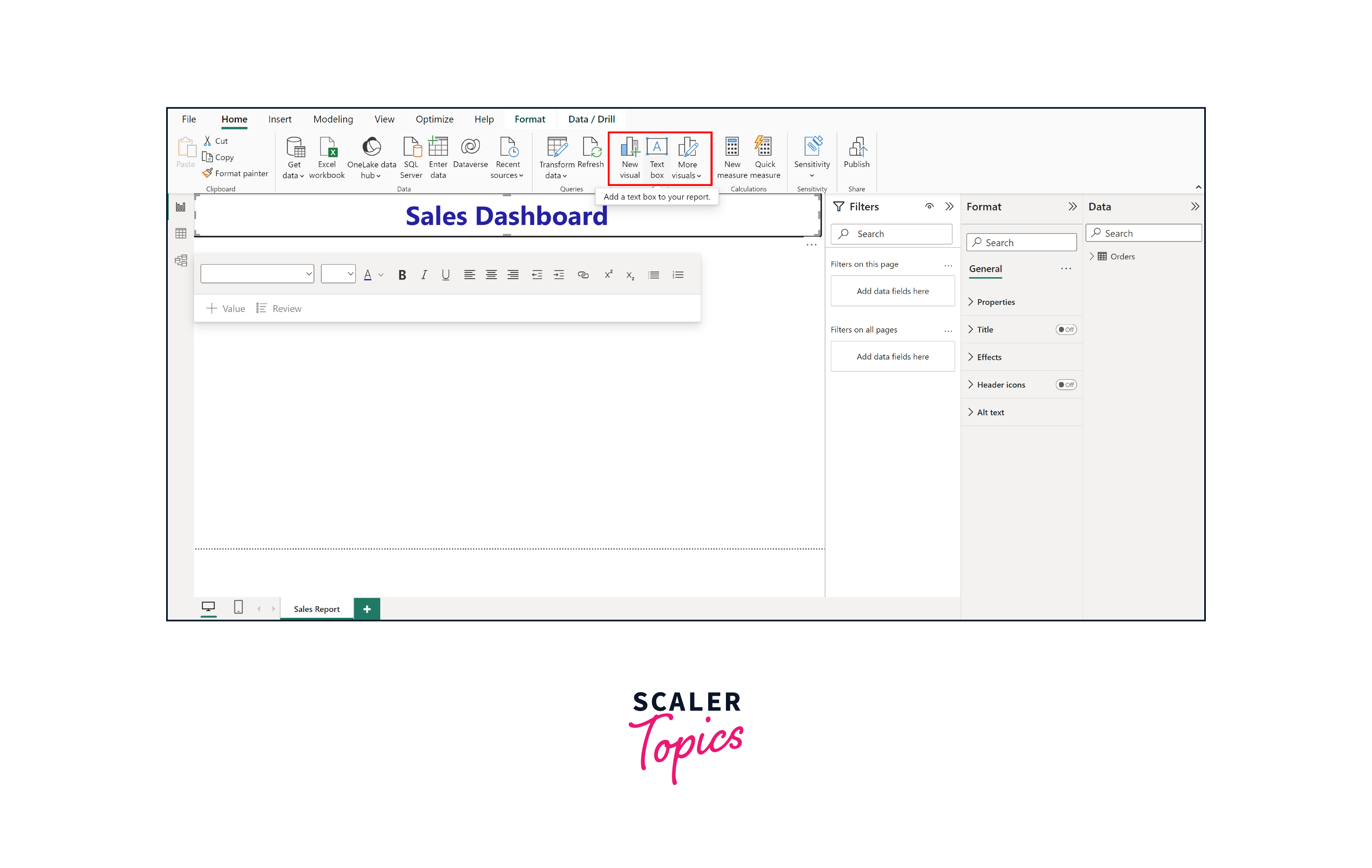 In the Home tab, opt for the Text box feature. Insert the desired text within the text box – for this instance, we'll use "Sales Dashboard." You also have the flexibility to personalize the font, color, background, and alignment according to your preferences.