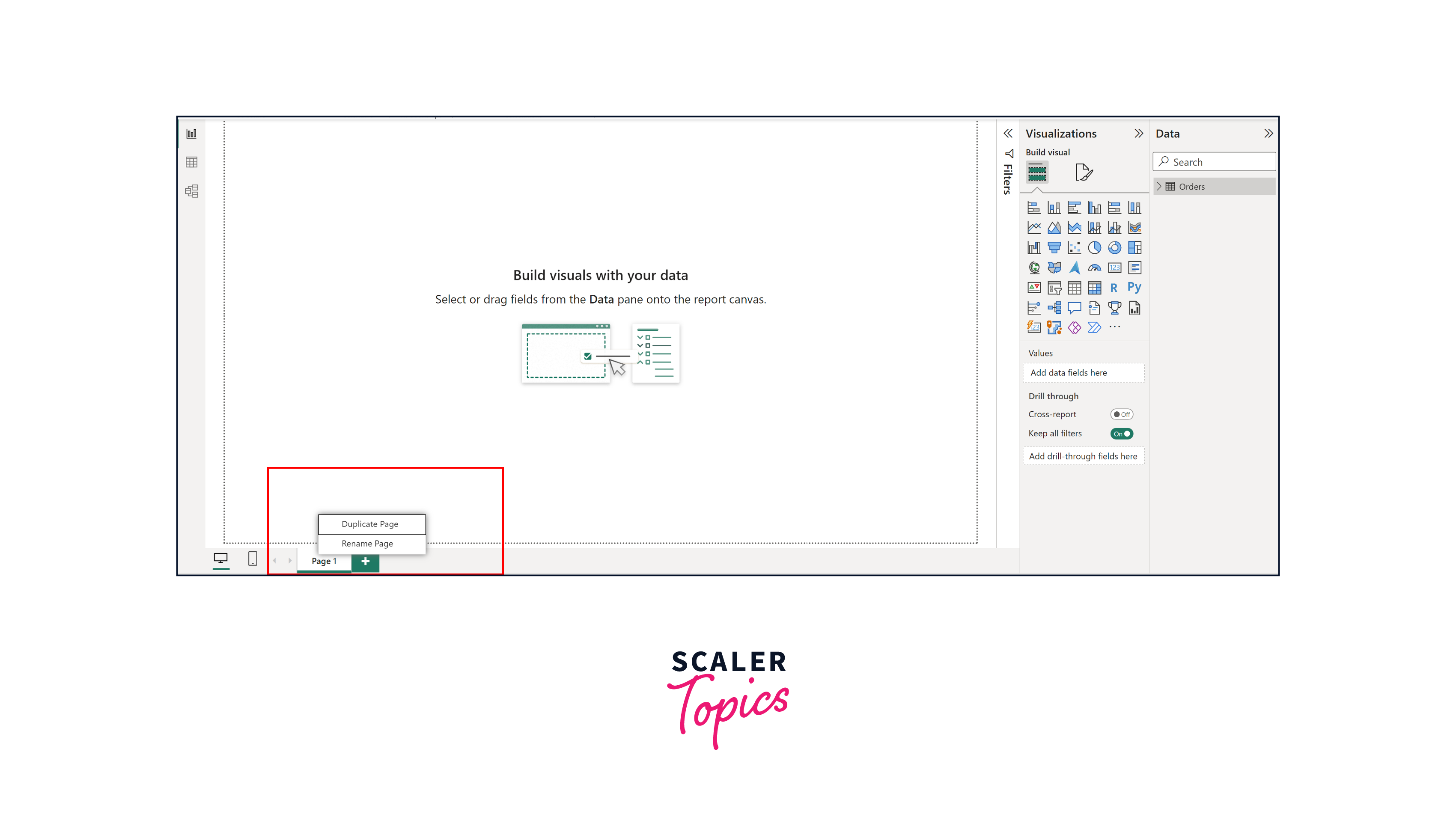 Once you've selected "Close & Apply," the report view will be accessible. To rename the report page within Power BI Desktop, click on the "Rename" option, as shown in the figure below.