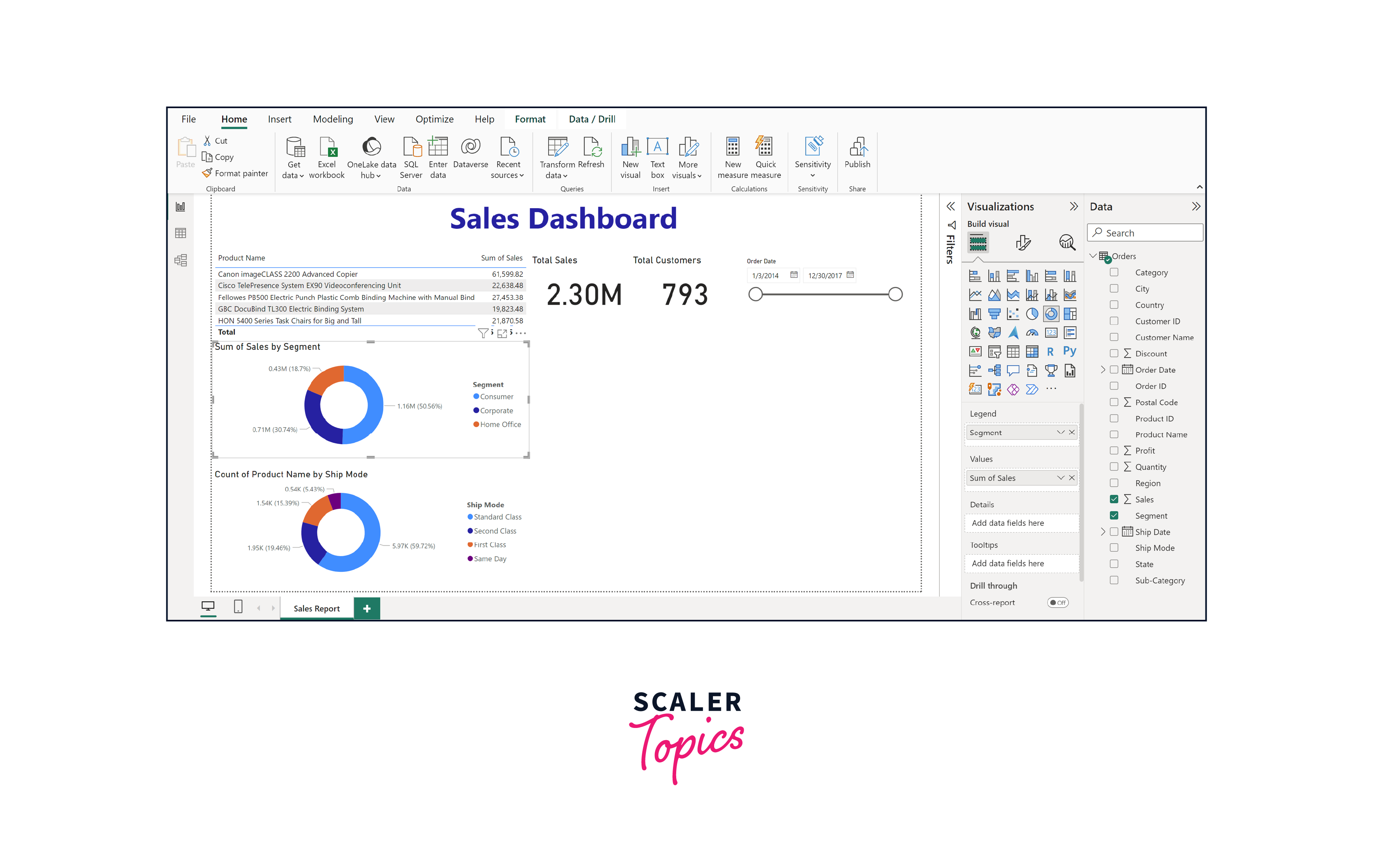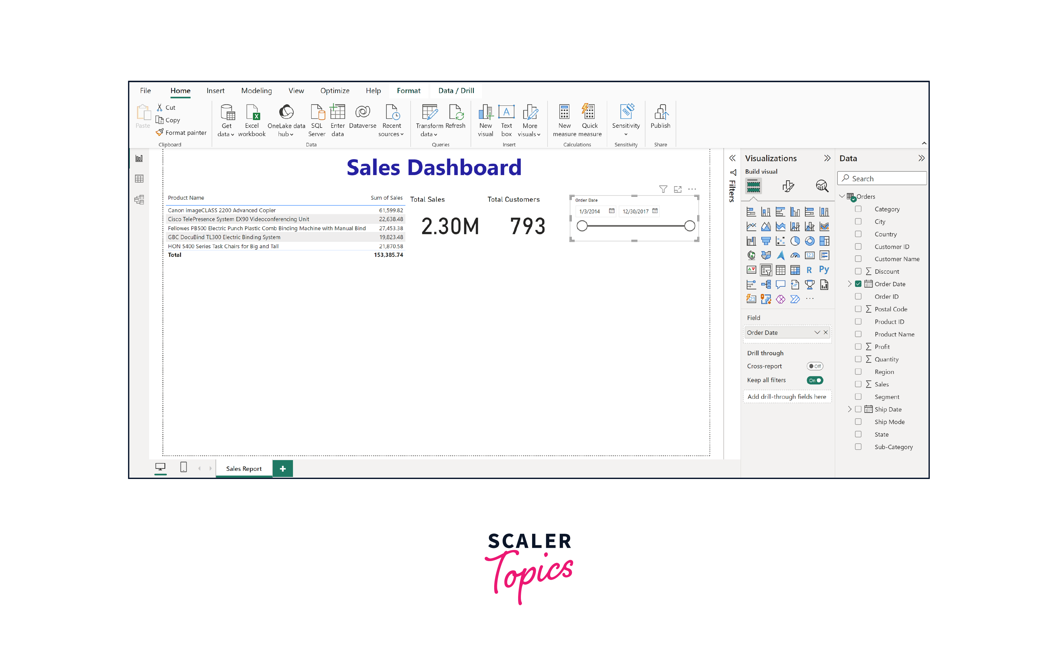 Opt for the Slicer visual type, then drag the Order Date column into the Fields section. Assign "Order Date" as the Slicer Header. Based on your preferences, you can proceed to choose the desired slider color, border color, position, line width, and any additional formatting options for the slicer visual through the tools available in the Format Visual tab.