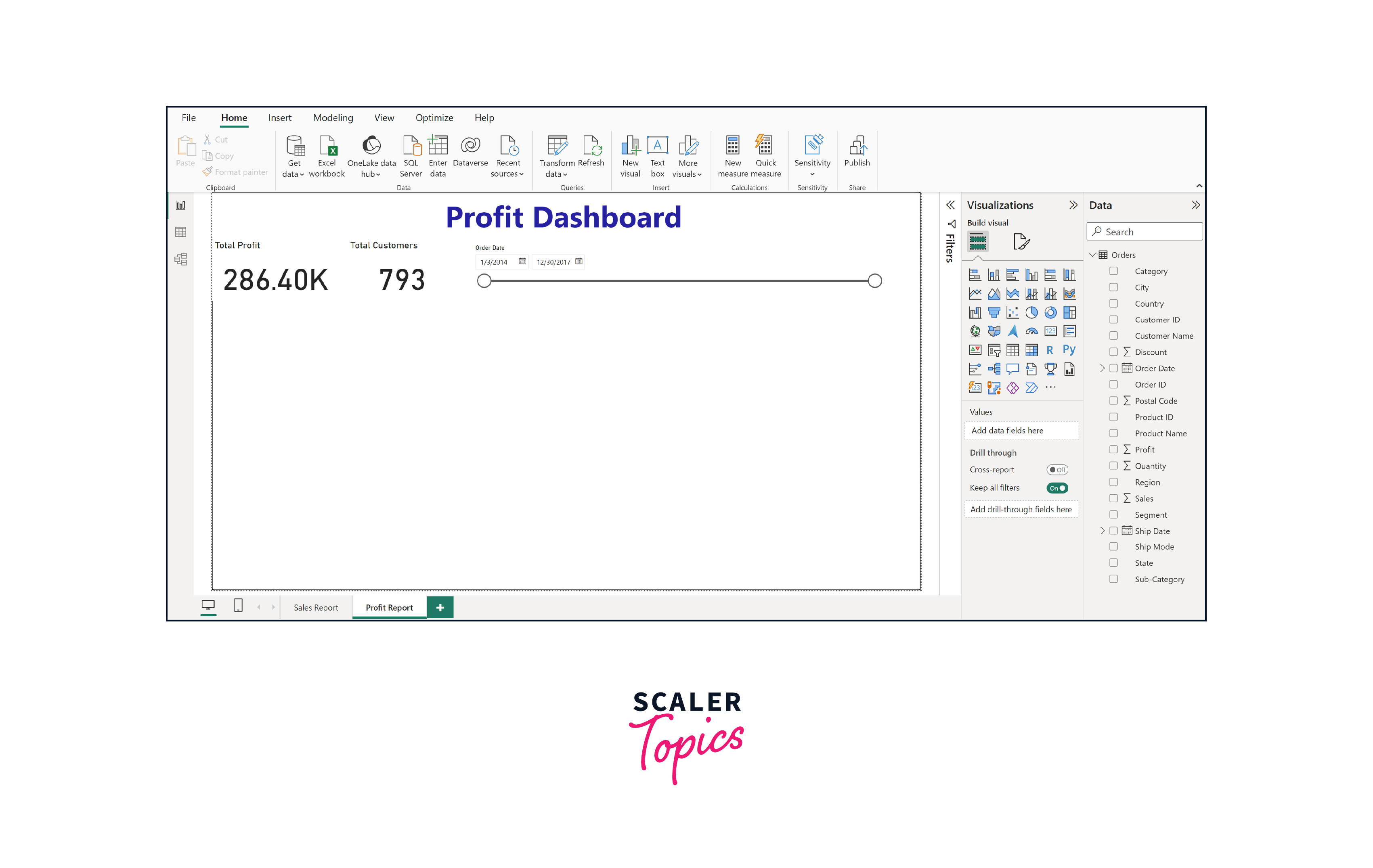 Next, introduce a text box to serve as the title. For this instance, we'll label it as "Profit Dashboard." Within the Build Visual section, we'll again incorporate two card visuals. The first card visual will showcase the Total Profit, while the second card visual will represent the Total Customers. Subsequently, we'll proceed to select the Slicer visual type. We'll drag the Order Date column into the Fields section and assign "Order Date" as the Slicer Header. This slicer will allow us to filter data based on order dates.