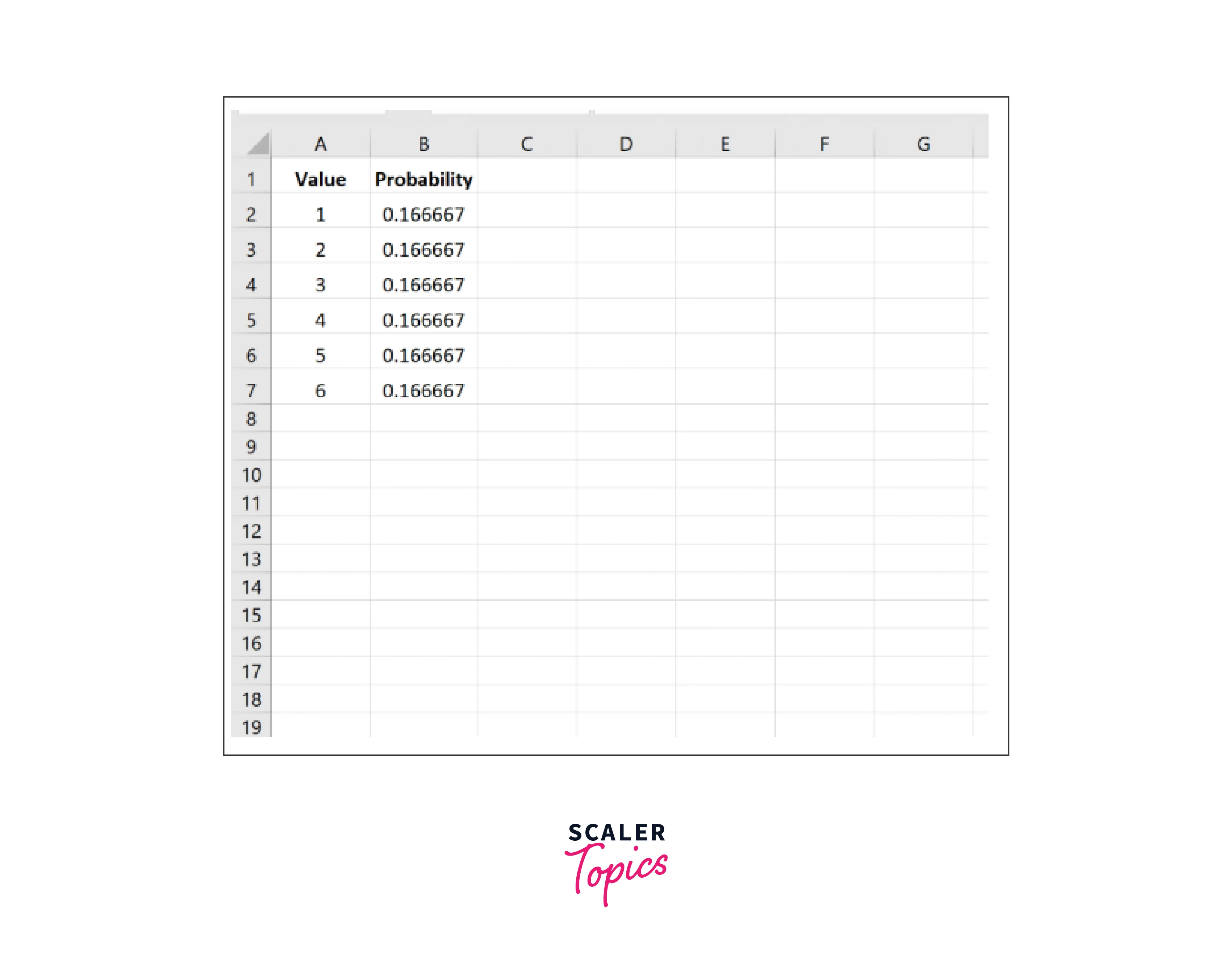 In the adjacent column (B2:B7), enter the probability values for each outcome. For example, since fair six-sided dice have equal probabilities for each number, the probabilities would be for each outcome.