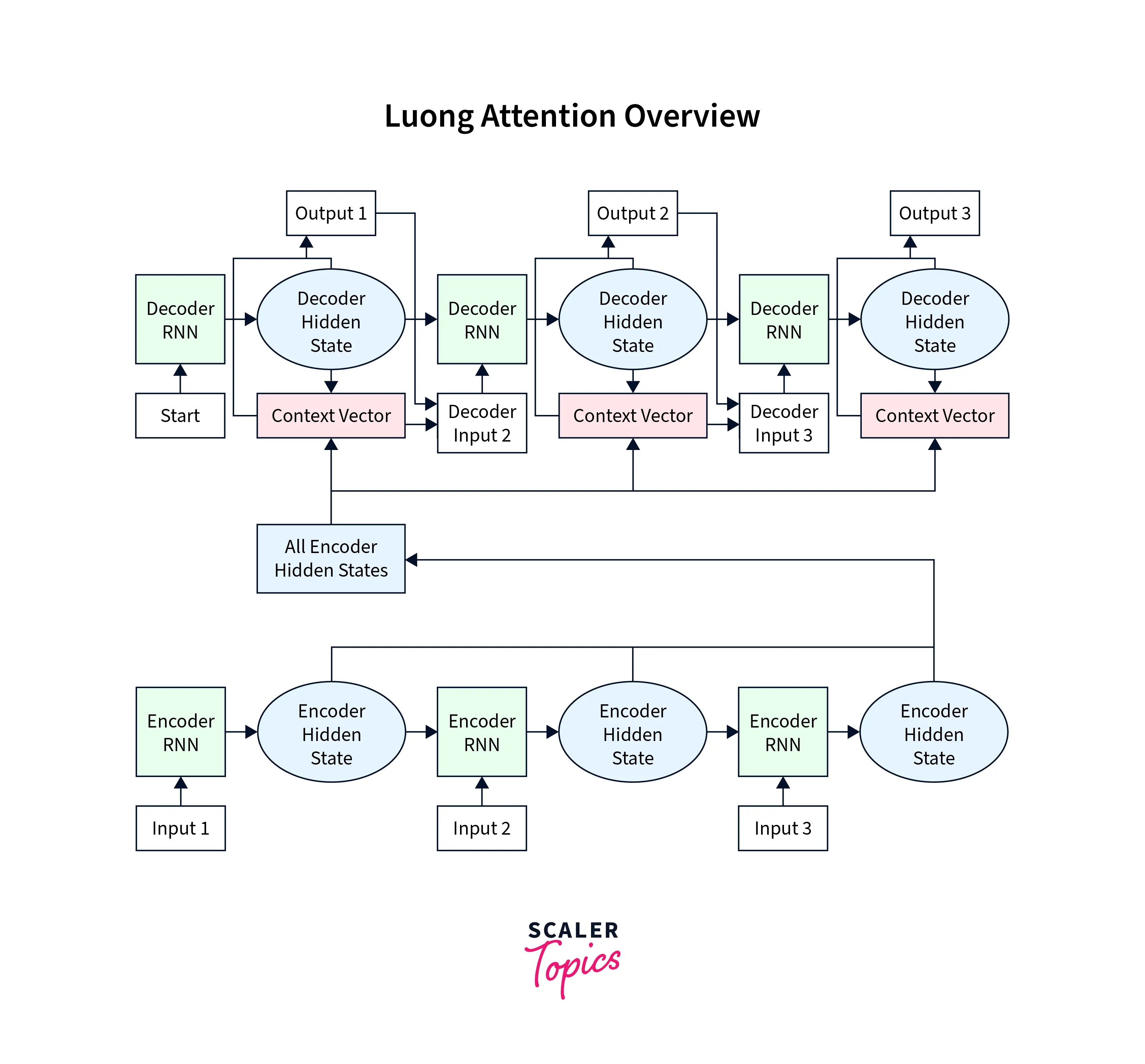 The other type of attention mechanism, called Luong Attention, is discussed below. There are two major differences between Luong Attention and Bahdanau Attention - the calculation of alignment scores and the position of introducing the attention mechanism on the decoder side.