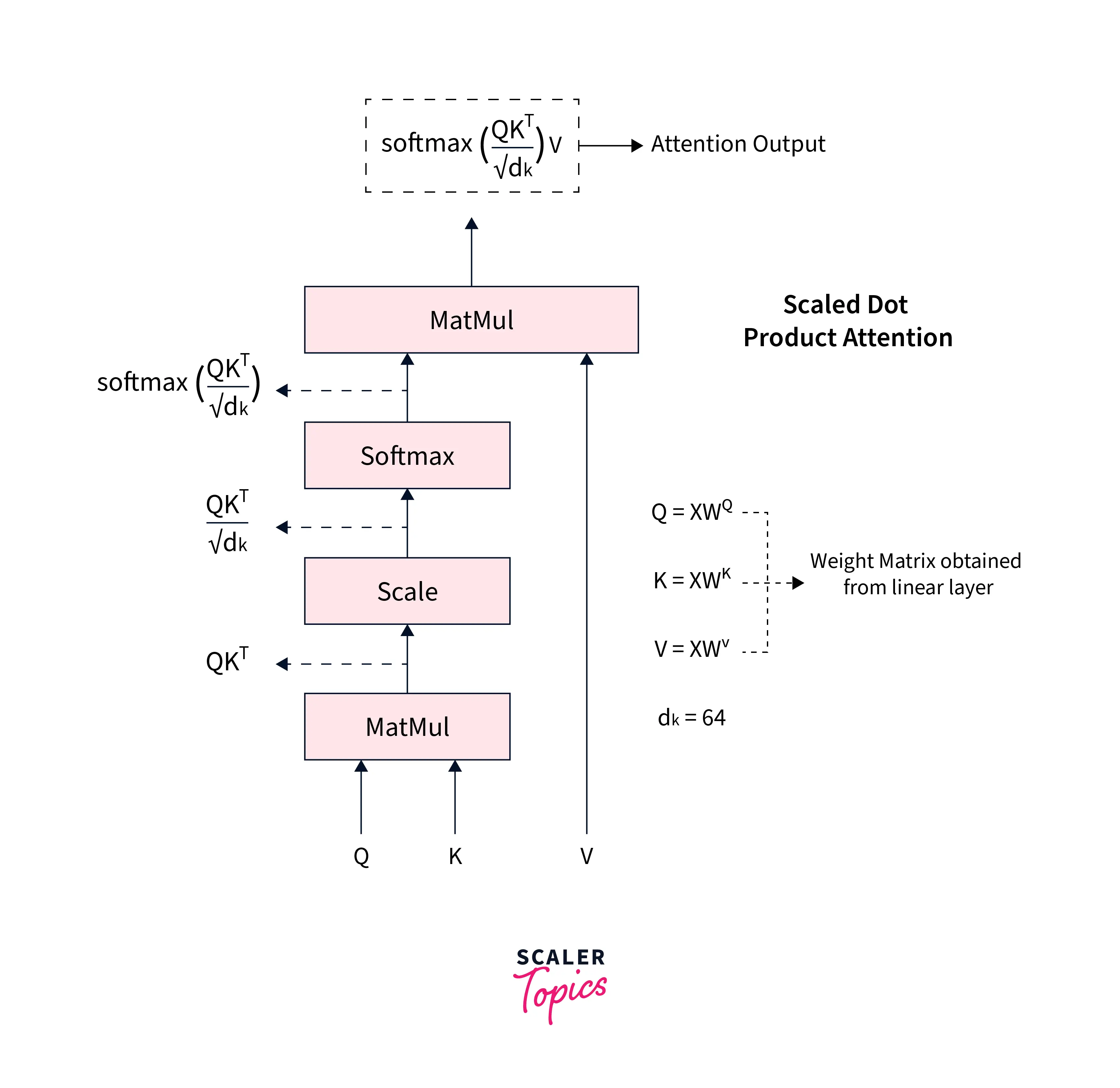 Self-attention in transformers is calculated using what is called "Scaled Dot Product Attention". Scaled dot product attention is calculated using three matrices called the query, key, and value matrices denoted by Q, K, and V, respectively.