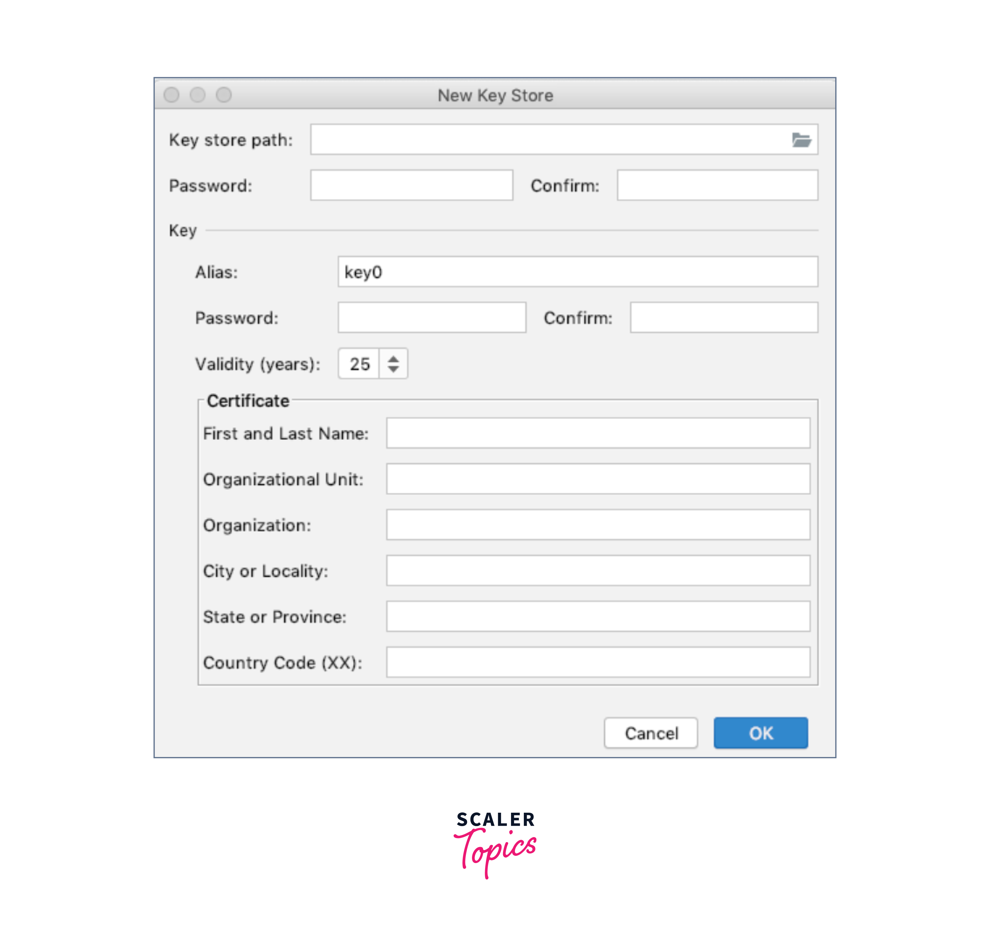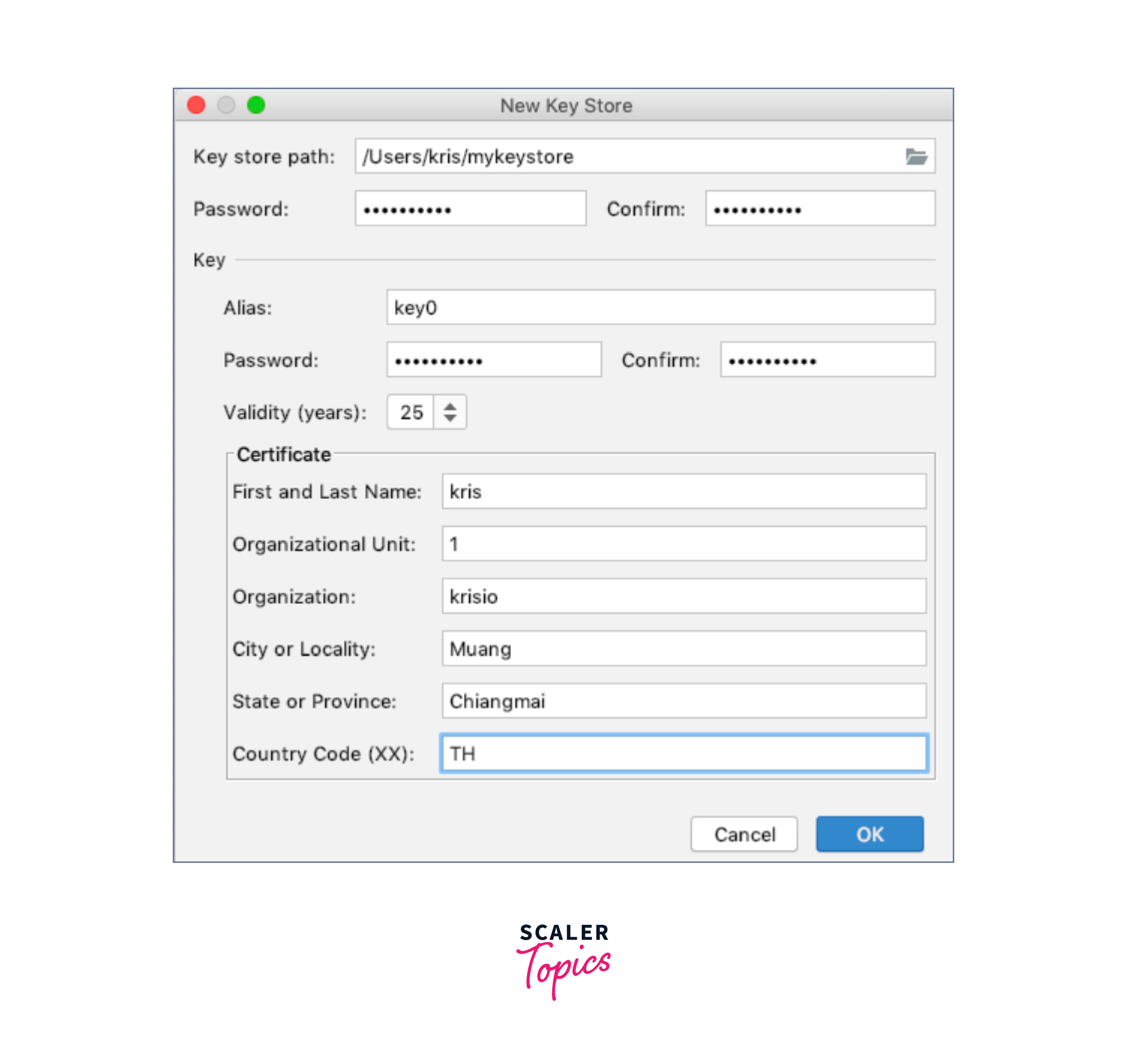 Choose passwords for the keystore and key, and provide the required certificate information.
