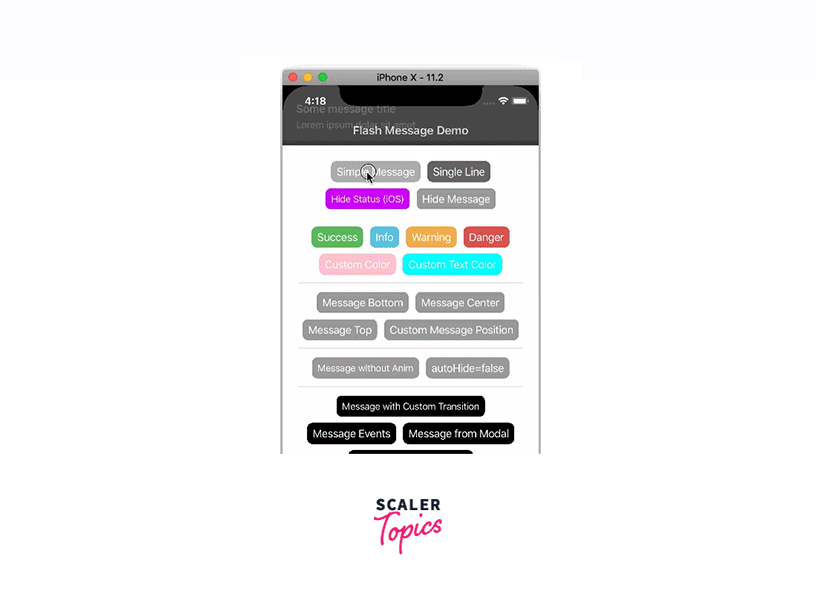 The primary component responsible for rendering messages in our application is referred to as DefaultFlash, which serves as the main MessageComponent. To address various aspects such as device orientations, statusbar heights, and the inclusion of iPhone X "notch" inset padding, DefaultFlash is encapsulated within another component called FlashMessageWrapper. This wrapper component ensures proper handling of these factors for an enhanced user experience. The below image demonstrates the various react native flash message components that we have discussed throughout the article.
