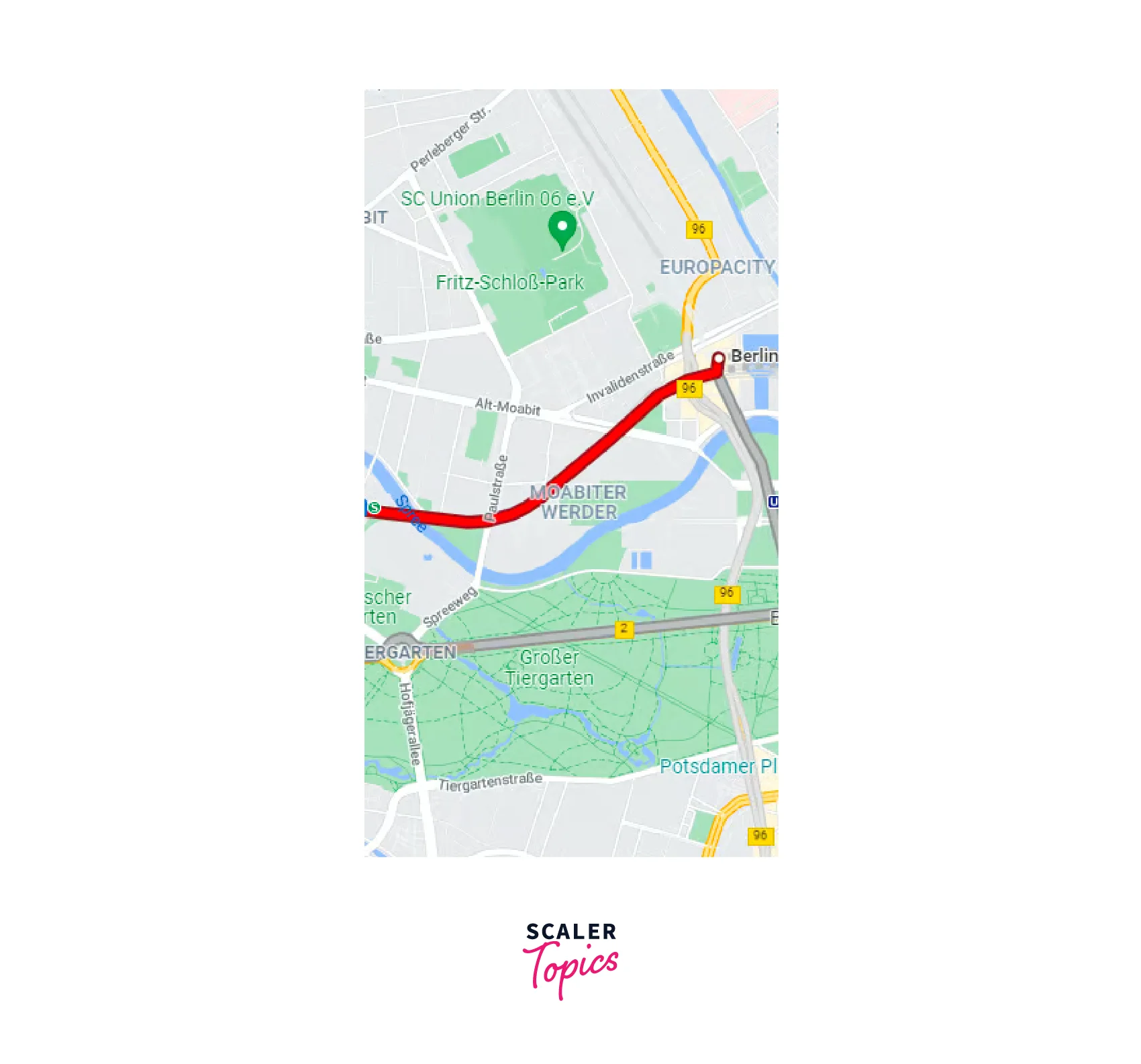 The line is ultimately constructed straight between these points, disregarding the real physical routes and highways. The Google Maps Direction API, which provides all feasible routes between two locations, must be used to construct numerous coordinates between the source and destination locations in order to do that.