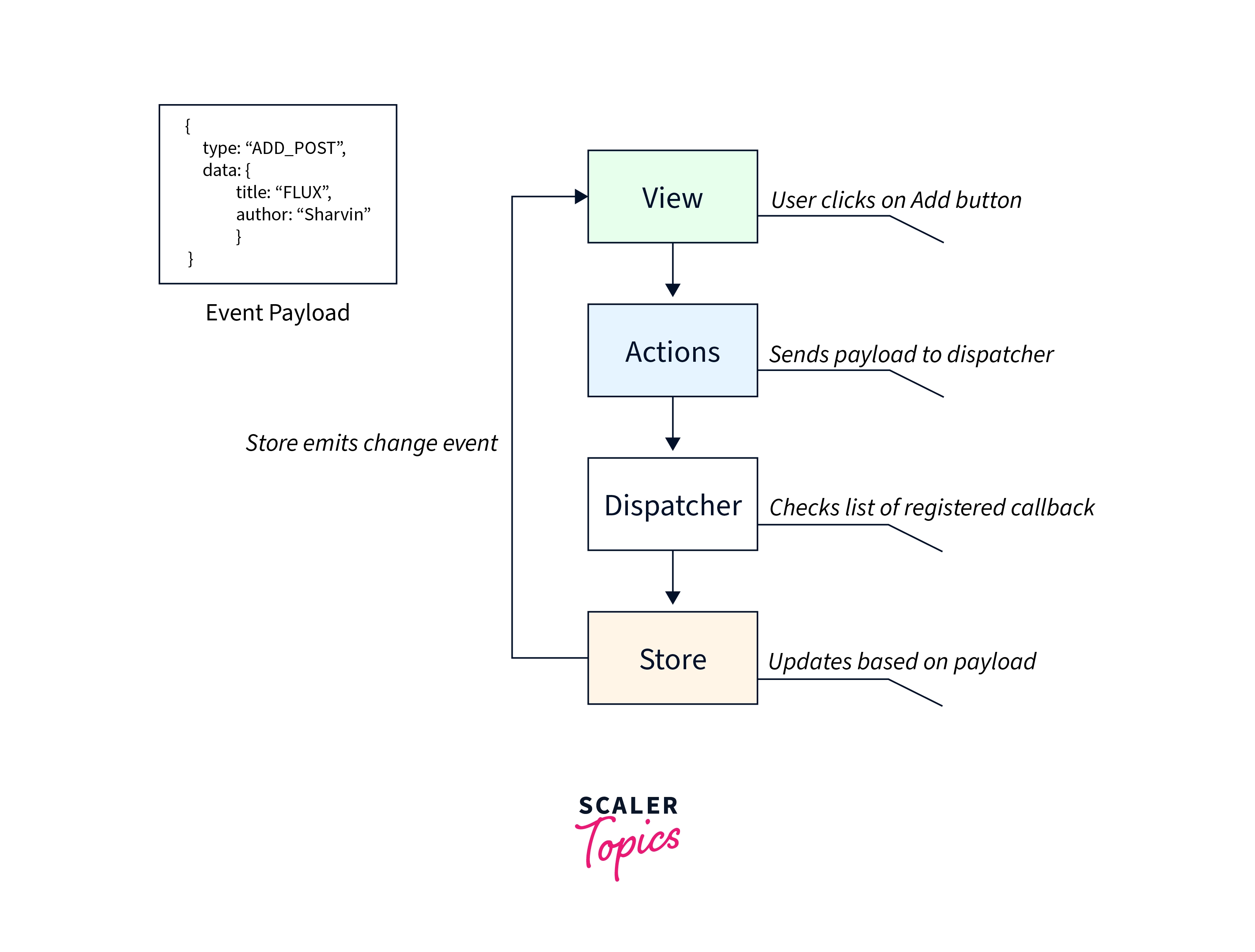 This takes care of all the events. The view component transmits these events. Calls to APIs are often made via this layer. When an action is finished, the Dispatcher is used to dispatch it. The action can be any user input, such as adding or deleting a post.