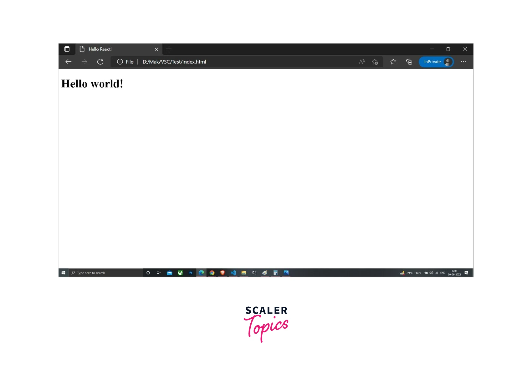 The root div element will serve as the app's entrance point. text/babel script type is used as it is mandatory for using babel. The h1 tag we created has been rendered to the DOM when you view the index.html file in the browser.