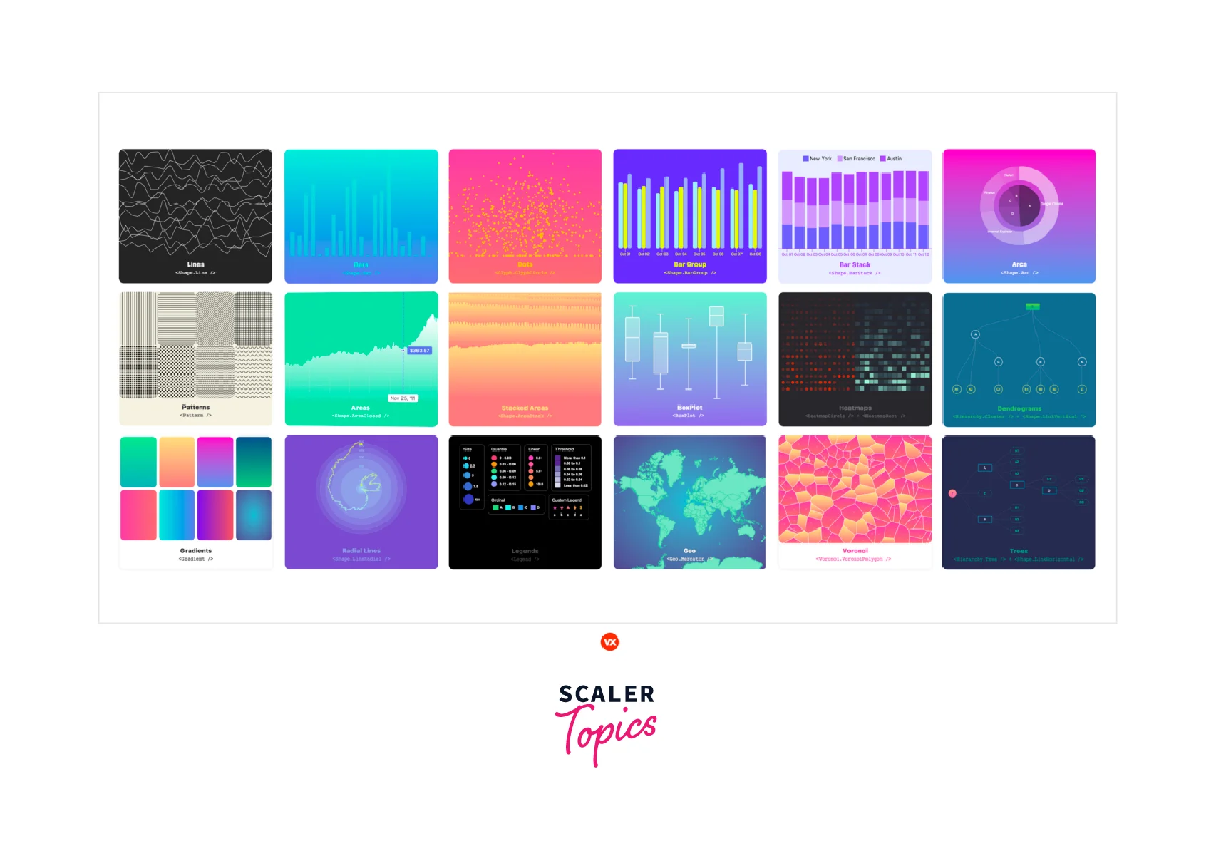 Visx is a react charting library built using the D3 library combined with features of the ReactDOM. This library is regarded as a collection of visualization primitives that are low-level and expressive. It is highly customizable and we can style our charts easily and also includes animations.