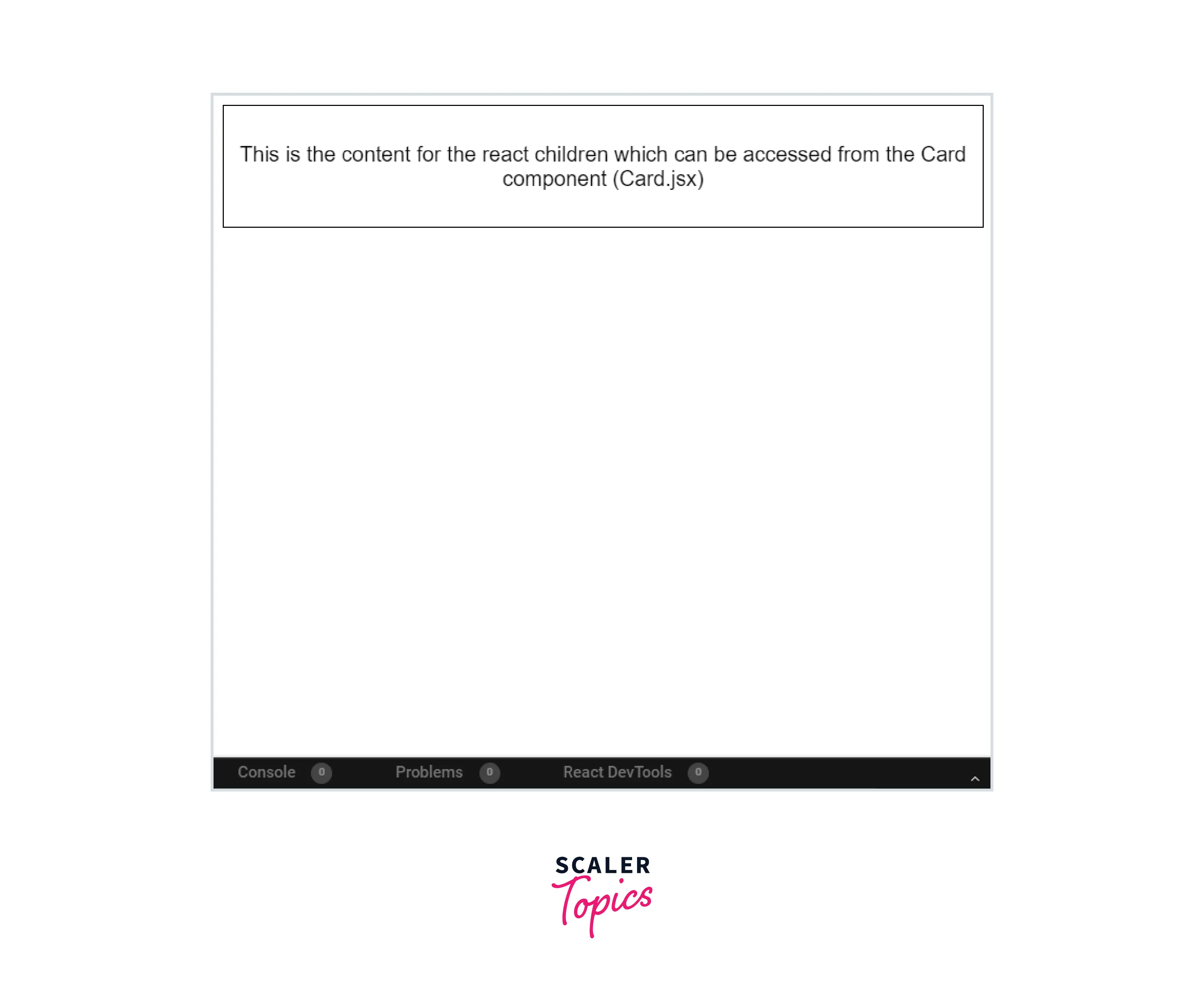 Let us discuss an example to discuss how we use children in React JS. We have a component 'Card' and the content written inside the 'Card' tags i.e. <Card> and </Card> will be passed as children.