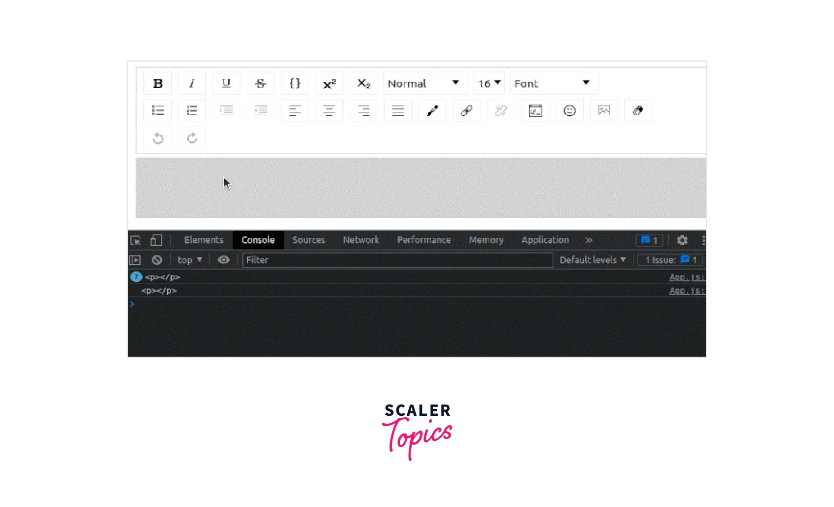 The value of the convertedContent state is updated by the code above using the useEffect Hook and the editorState dependency array. After running the above code and adding some text with styles, you can view the current editor's raw HTML content on your browser console as shown below :