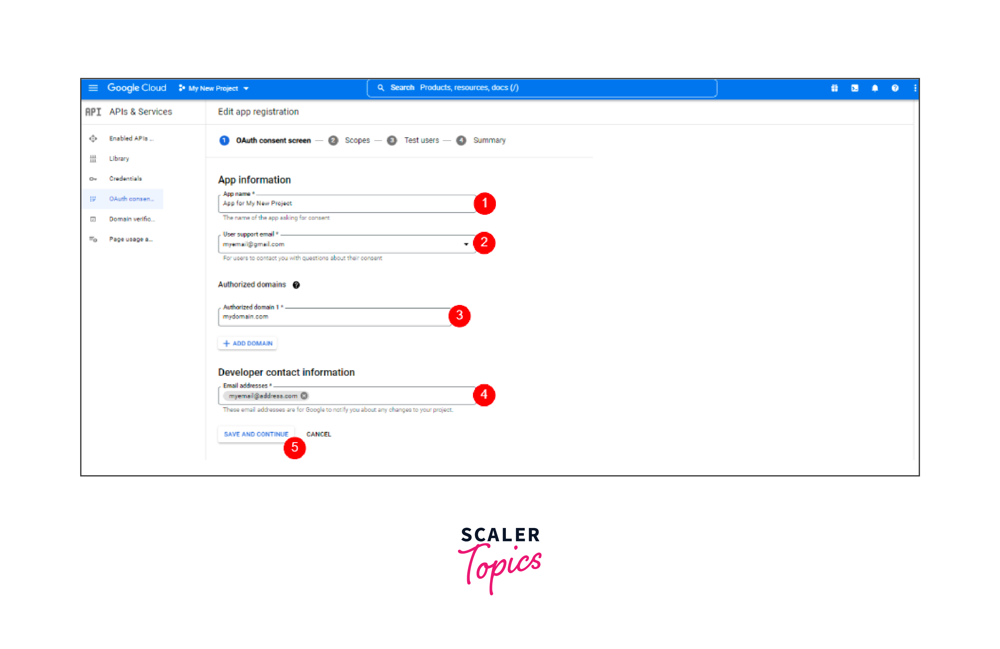 - Click the Add Application Name -> Support Email -> Accepted Domains -> Developer Consent Information -> Save and Continue button
