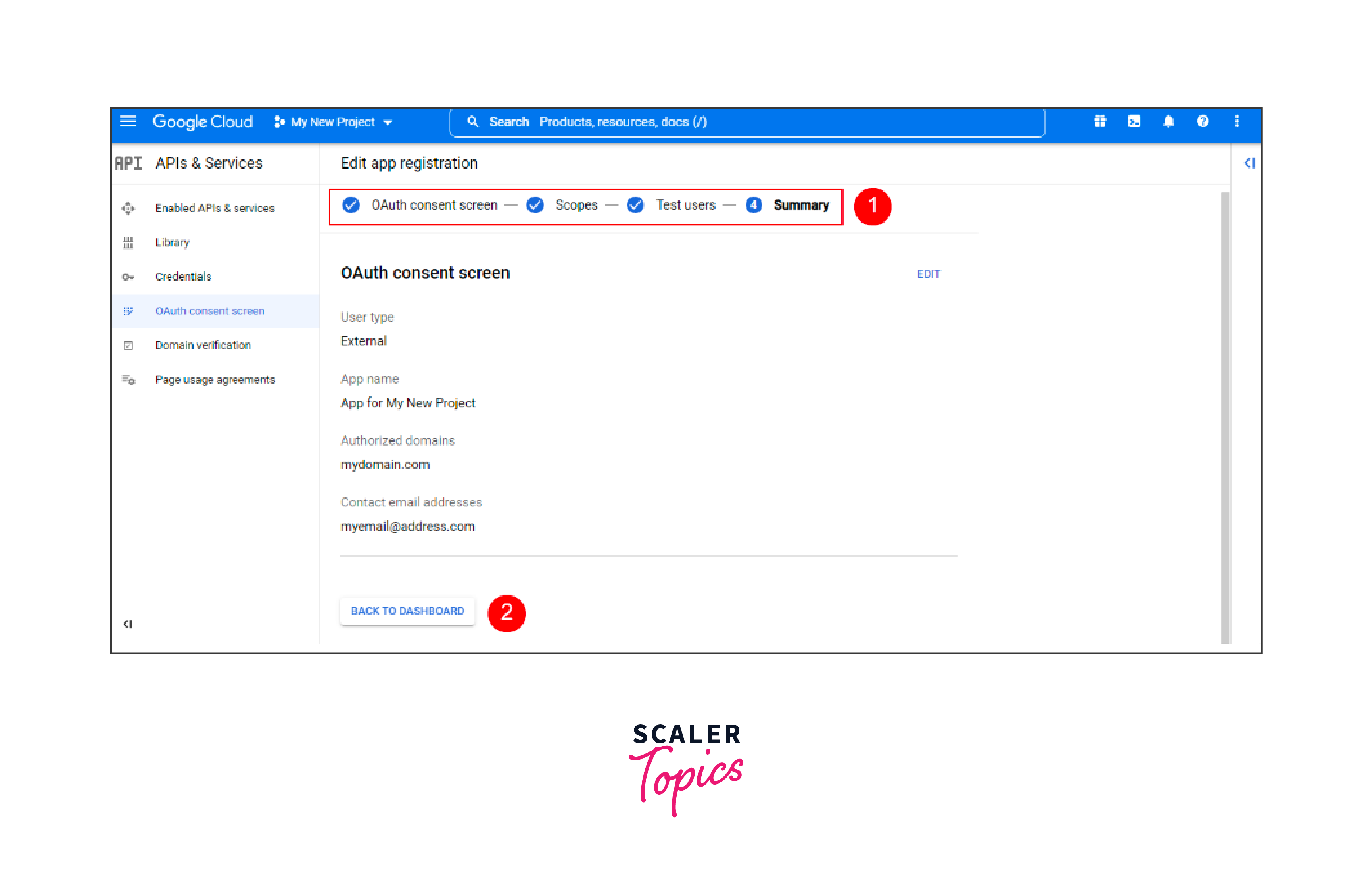 - Complete all four steps on the OAuth Consent Screen and click the Return to Dashboard button