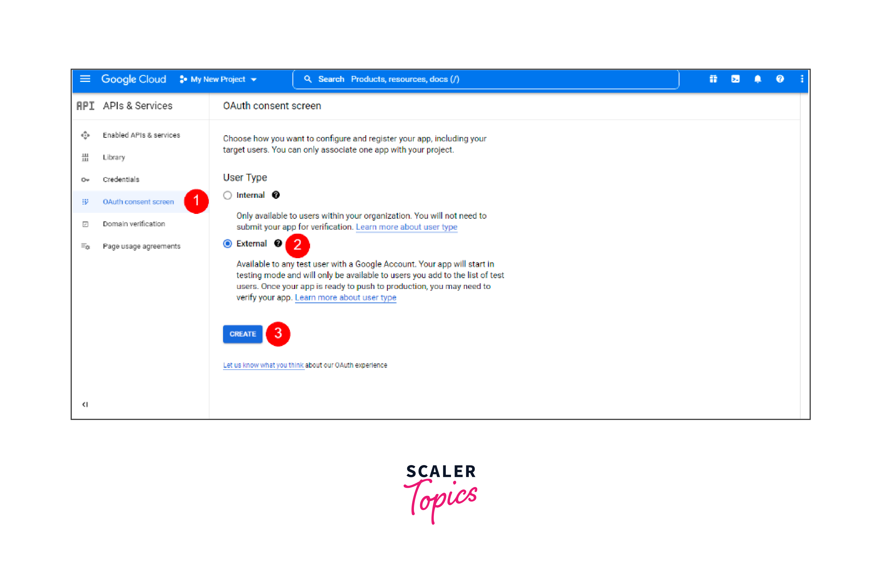 - In the left menu, click OAuth Consent Screen, select a User Type, and click the Create button