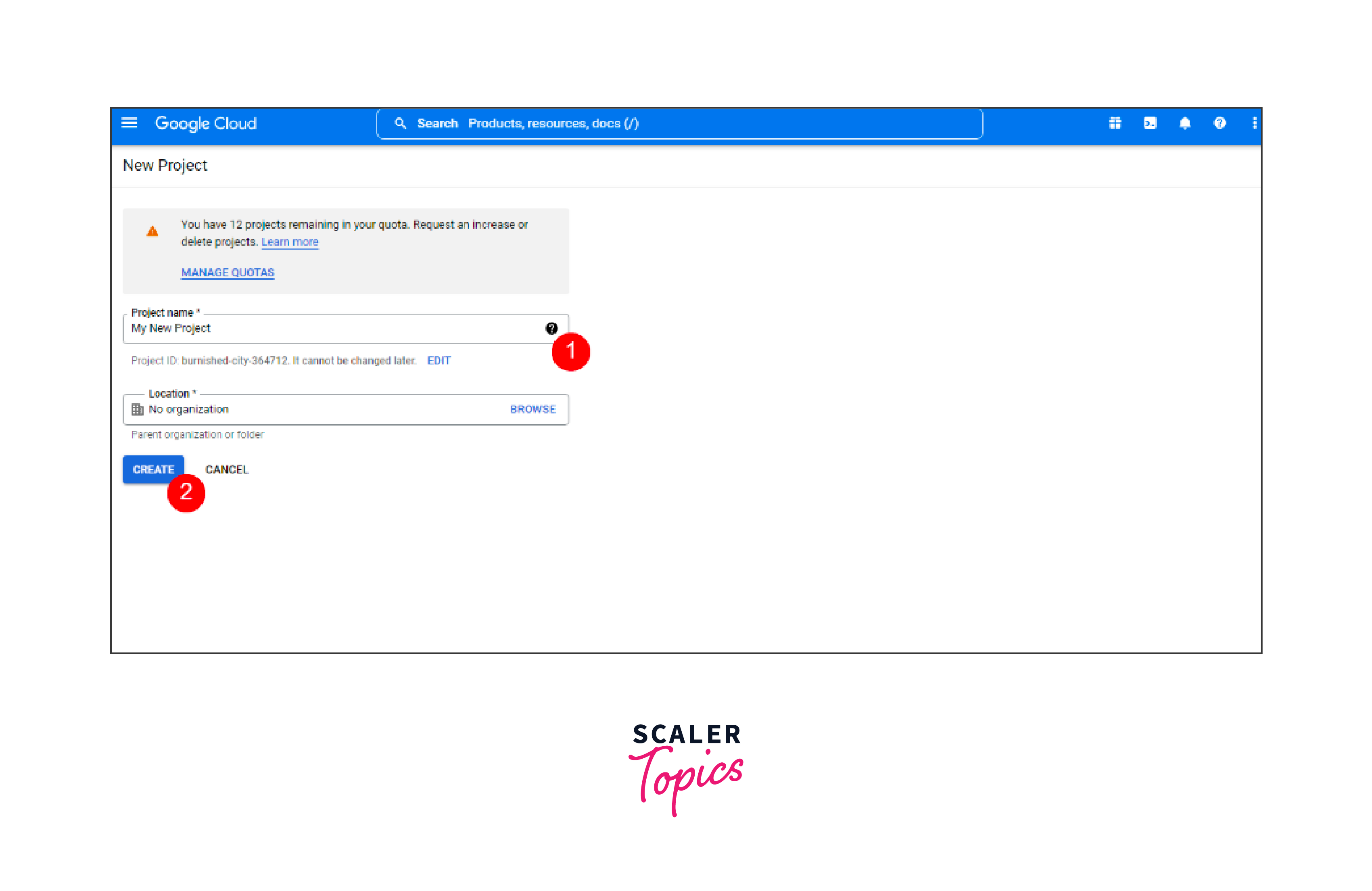 After creating the project, go into the project and you will see a dashboard like this: Your current project name should be displayed next to the Google Cloud Logo in the upper left corner of the dashboard page.