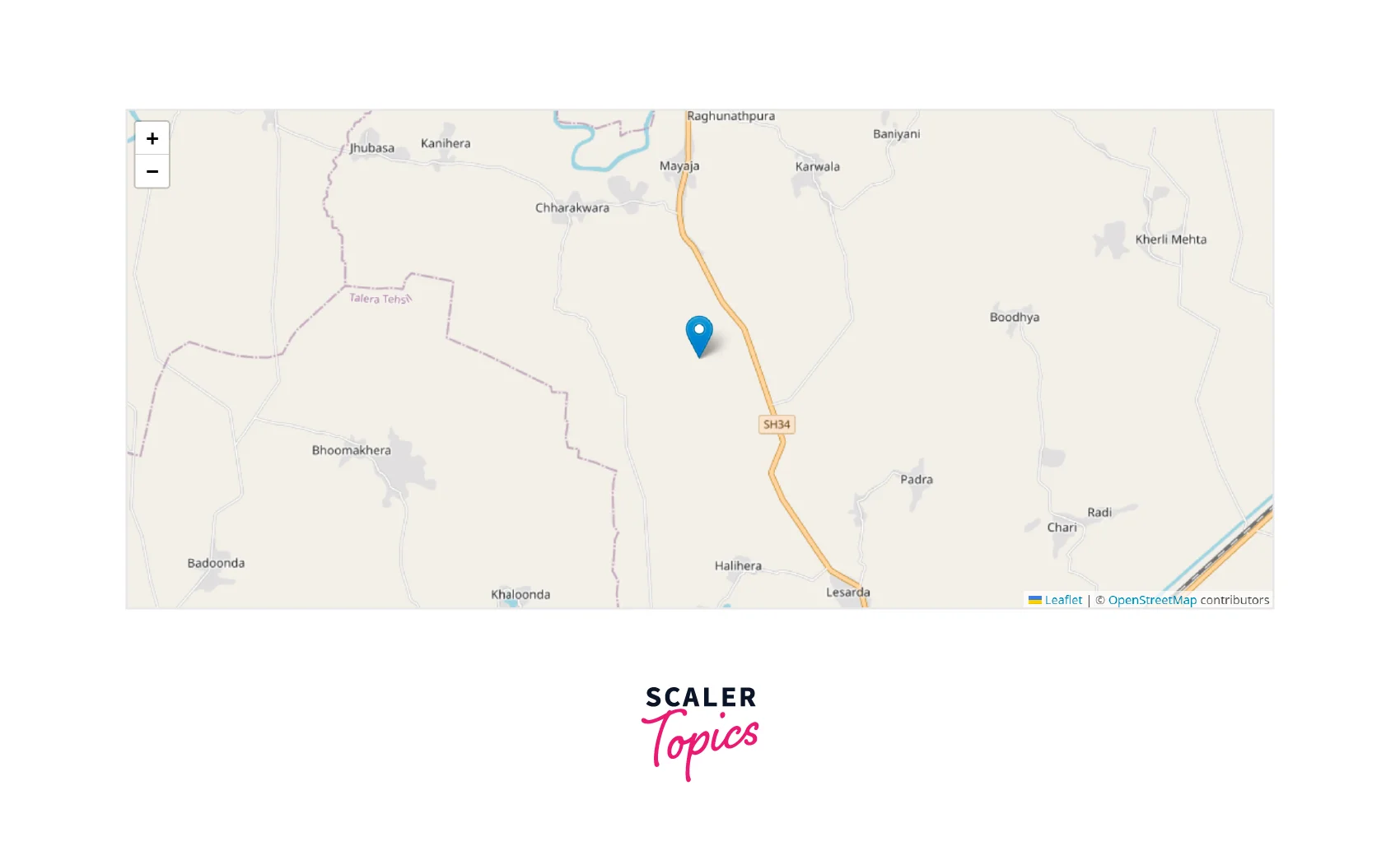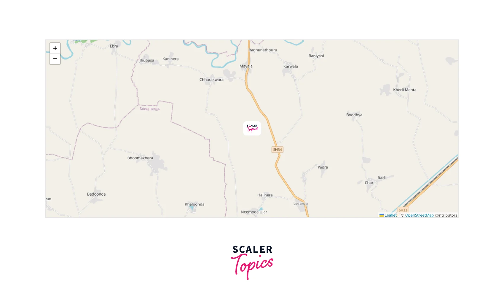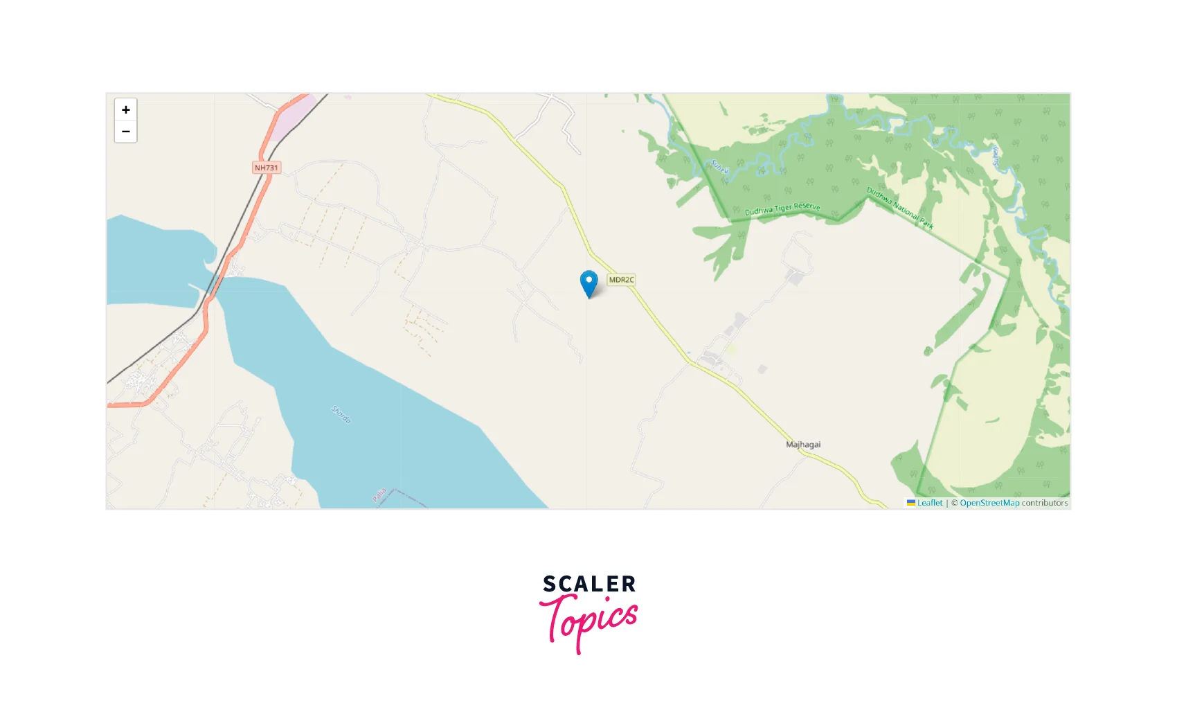At first, we are defining an array named location, a pair of latitude and longitude points to point to a specific location on the whole geographical plane. It is the same point we want to act as the center of our map. Then inside the App component, we are rendering the MapContainer component, in which we are passing the center of the map to be at our location array and a zoom prop which defines what should be the scale at which we want to zoom-in to our location array. Setting zoom={1} or less will zoom out entirely and display the world map as a whole, while as we increase the zoom number, it will subsequently zoom in more precisely at our desired pointed location.