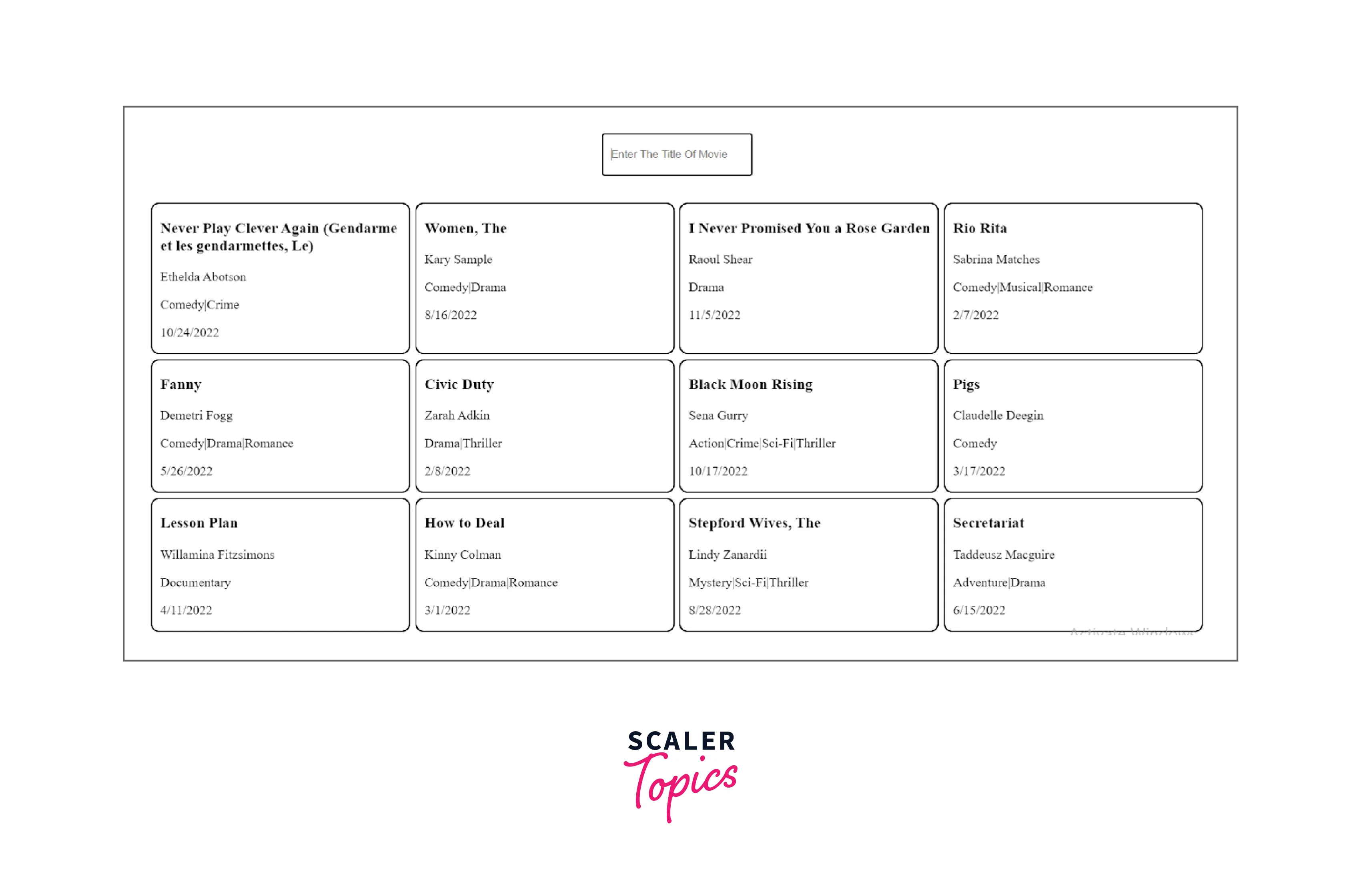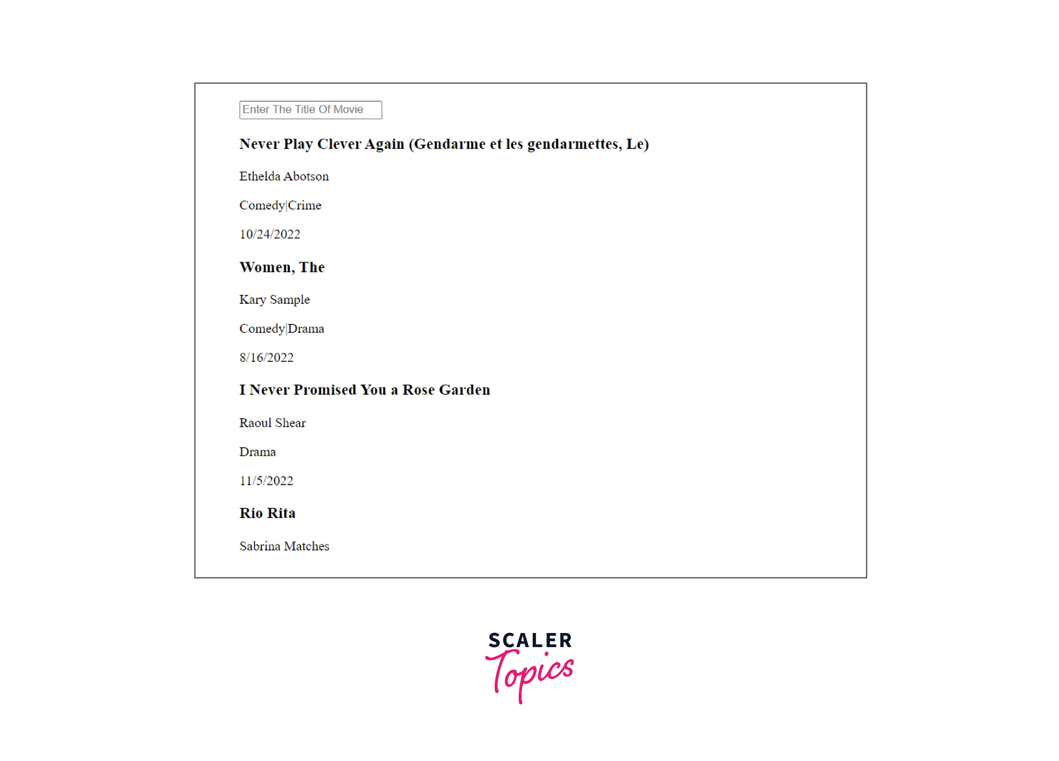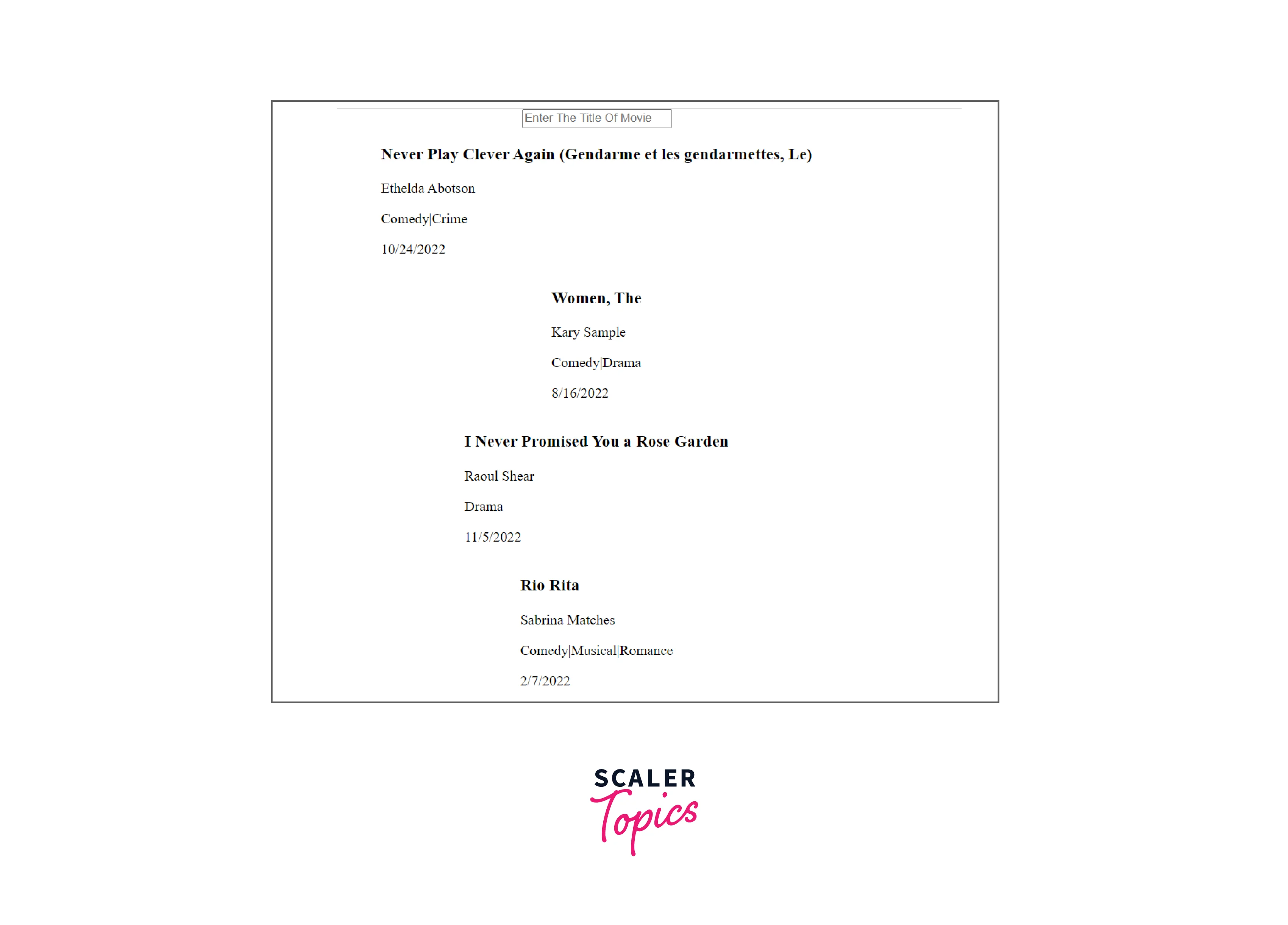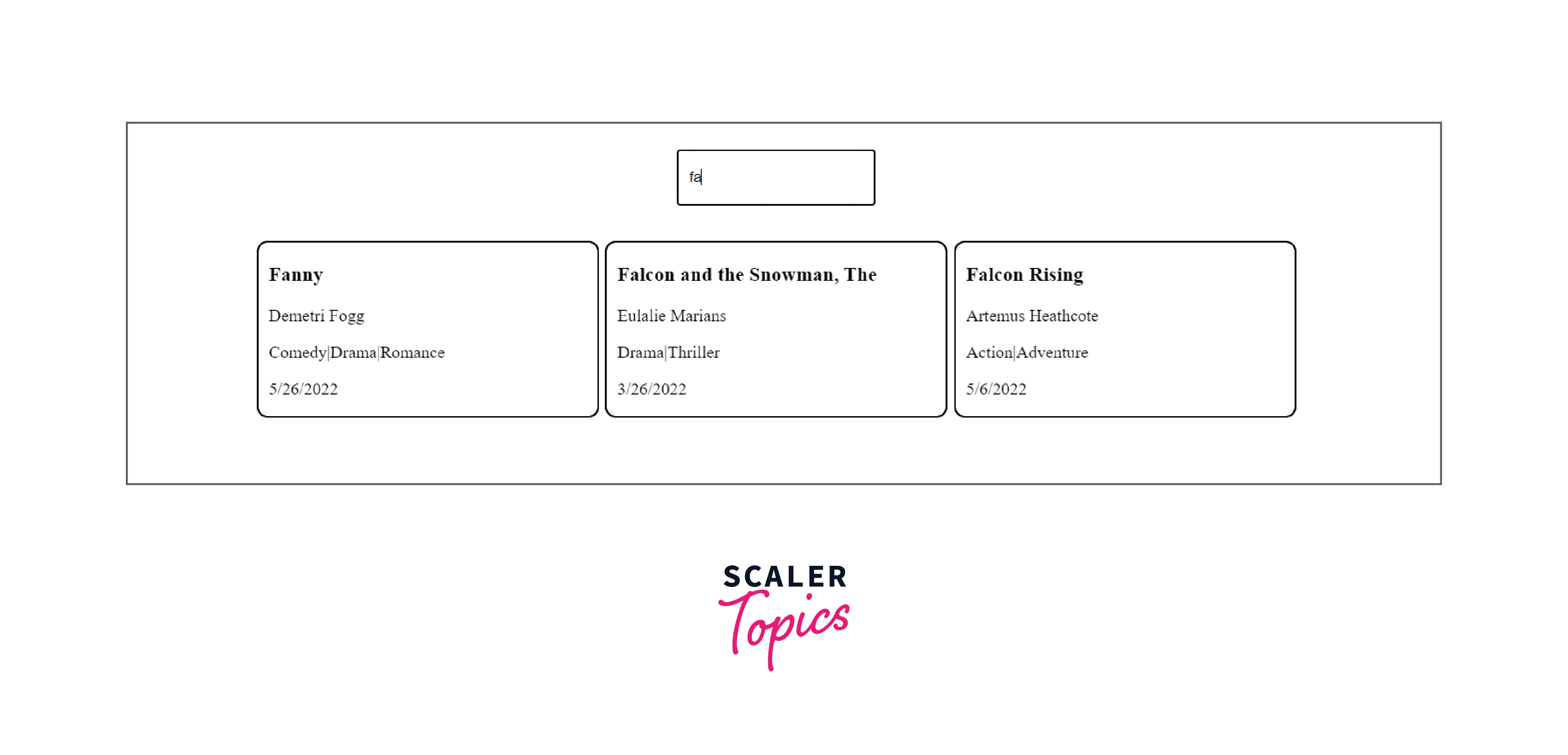If any of the data match the entered query (in our case, a movie name from our example movie), then it will return a new array with the objects that match the user-entered query. It is advisable to transform both the user-entered query and the movie to prevent any mistakes brought on by incorrect letter capitalization. Lowercase the name from the false data. In this manner, our filter will always be able to output a matched result if one is found, regardless of what the user types in or how many lowercase letters are used.