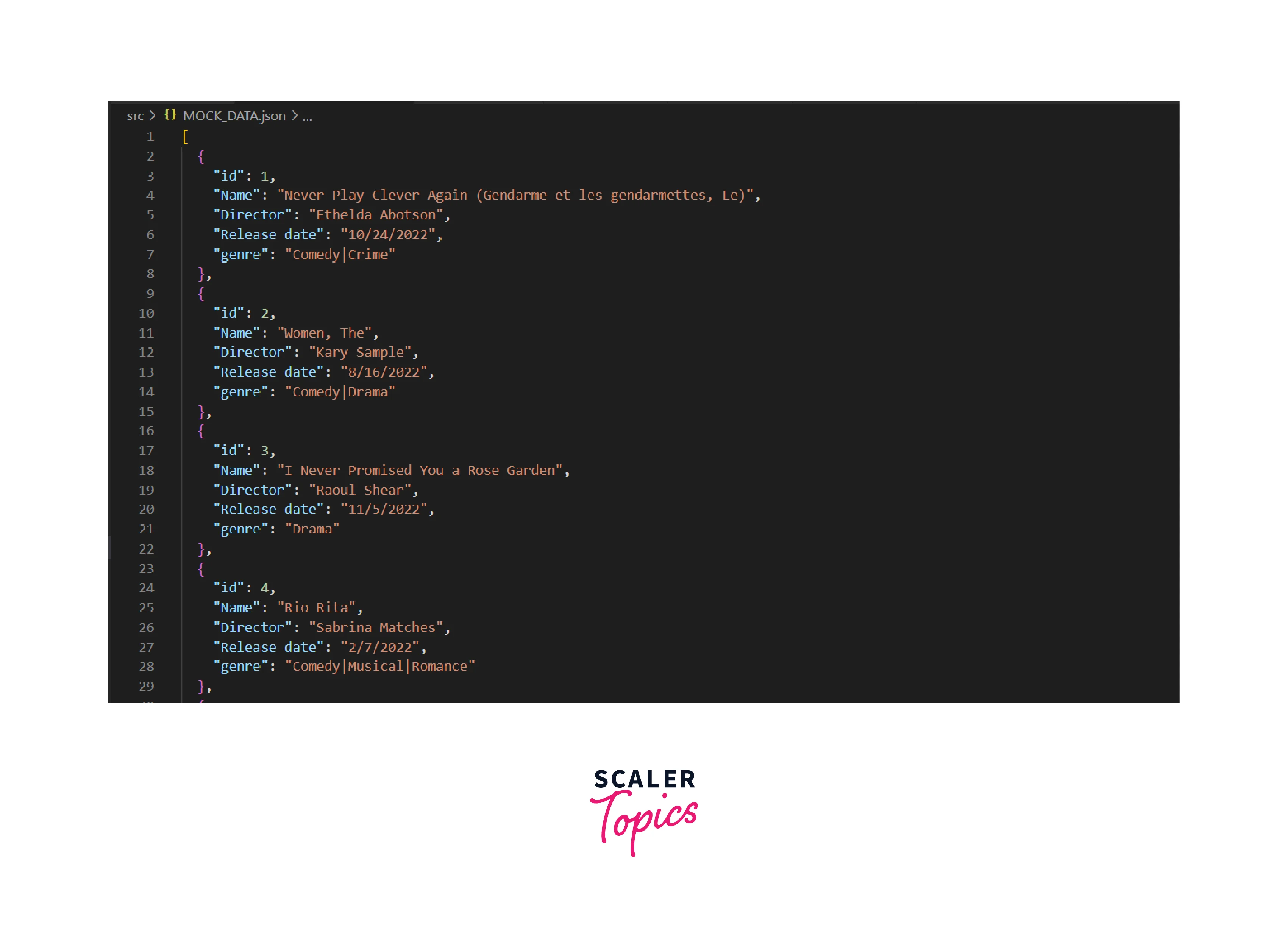 Create a new file, mock_data.json, and paste the generated data into it. This is how the JSON file will appear :