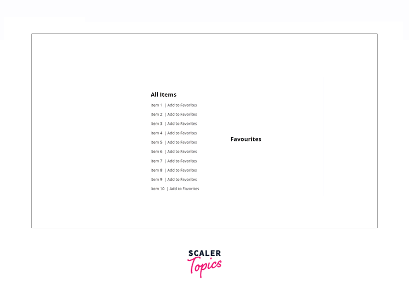 Inside the JSX, we are firstly listing out the items array, which we have initialized in our app; inside it, we are having a li item rendered which displays the name of the item, and a span element which calls the toggleInFav() function to add that specific item to the favItems array.