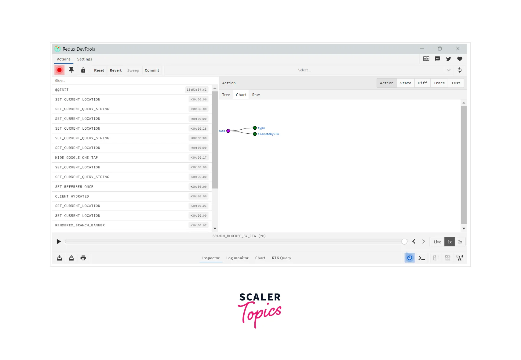 - Action - Clicking on it will show us the individual action type and any data it carries to the reducers. It has furthermore two three views - Tree view (summarizes the data into single lines), Chart view (shows the store tree, including all the reducers and their corresponding data branches), and Raw view (shows the action creator in a coded form).