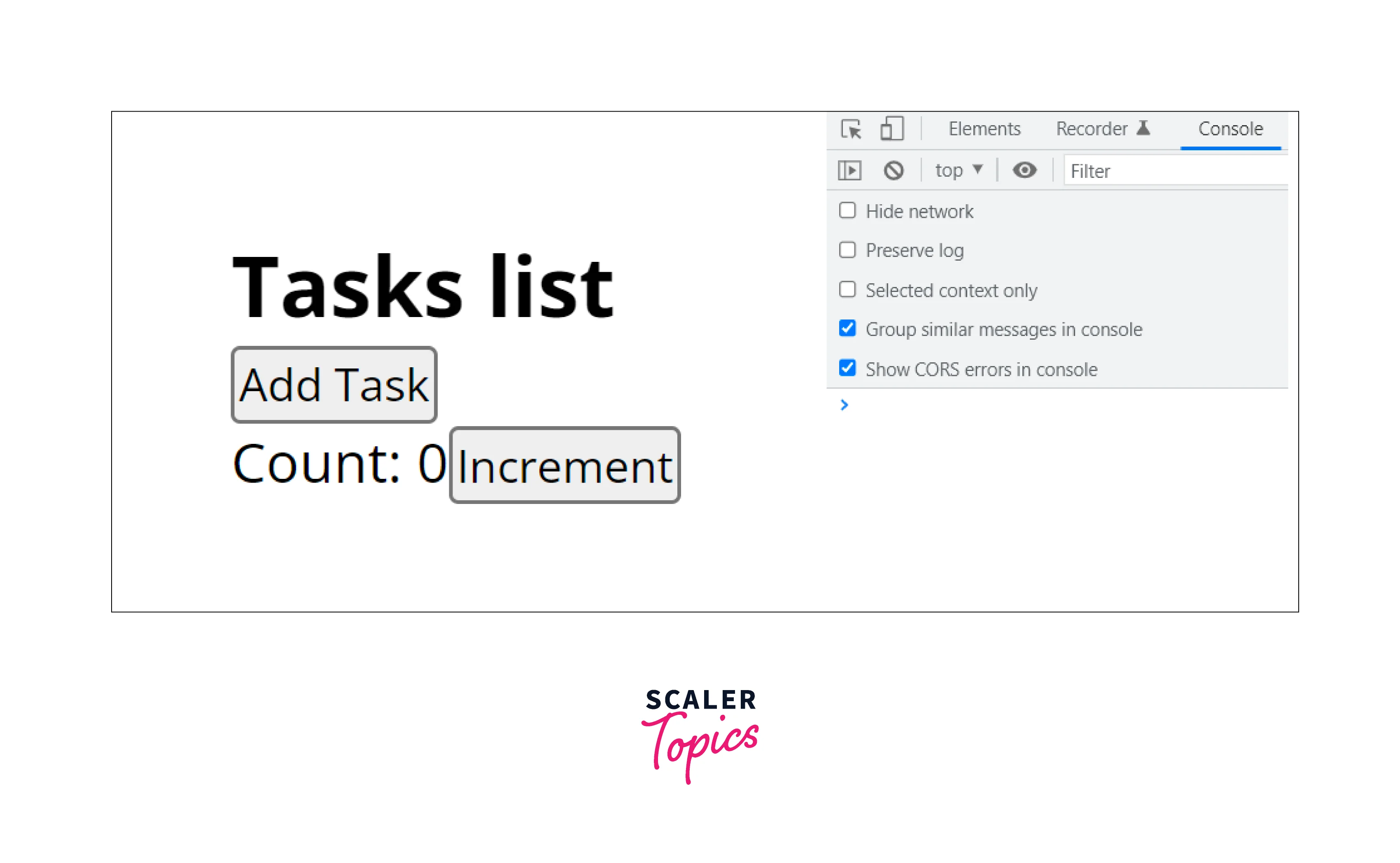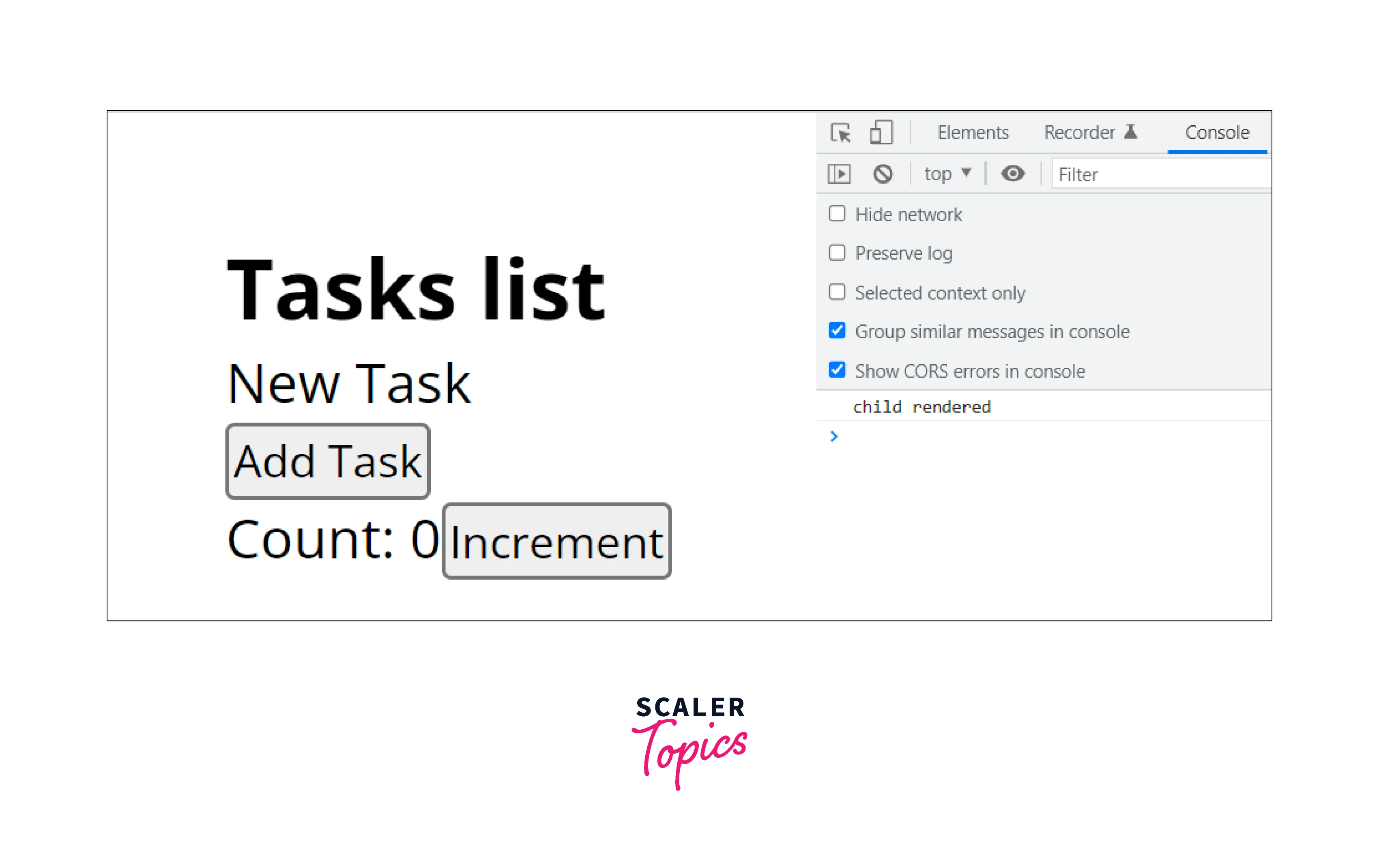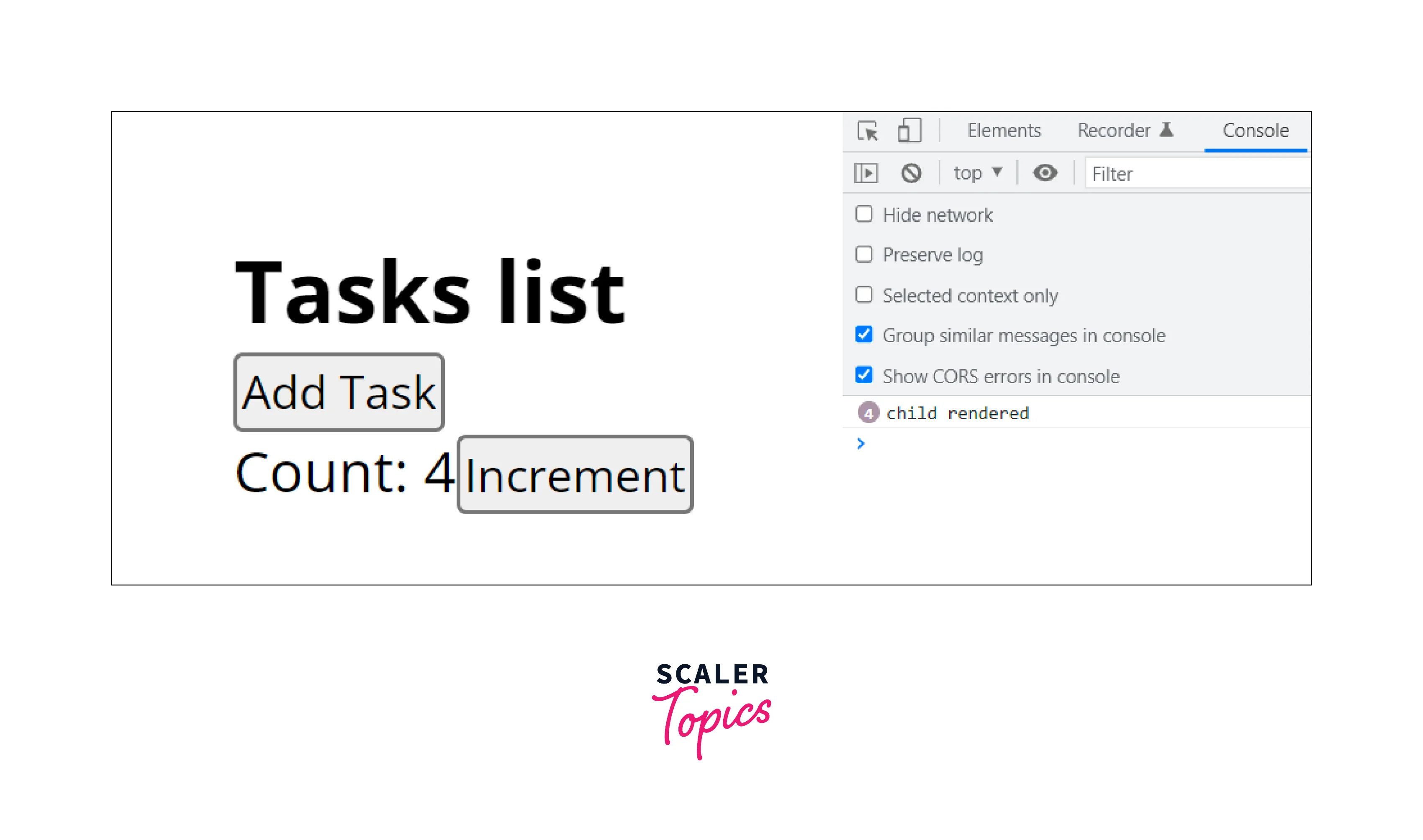 Here, we can see that we have cached the result of our addTask() function using the useCallback hook and have instructed react to only re-compute and reconstruct the function if the state associated with it, i.e., the tasks state gets changed. And we can see that in that output, after clicking on the Increment button, the child component, i.e., the Tasks component, was not getting rendered, but as soon as we clicked on Add Task button, the component got recomputed and we can see the result in the console.